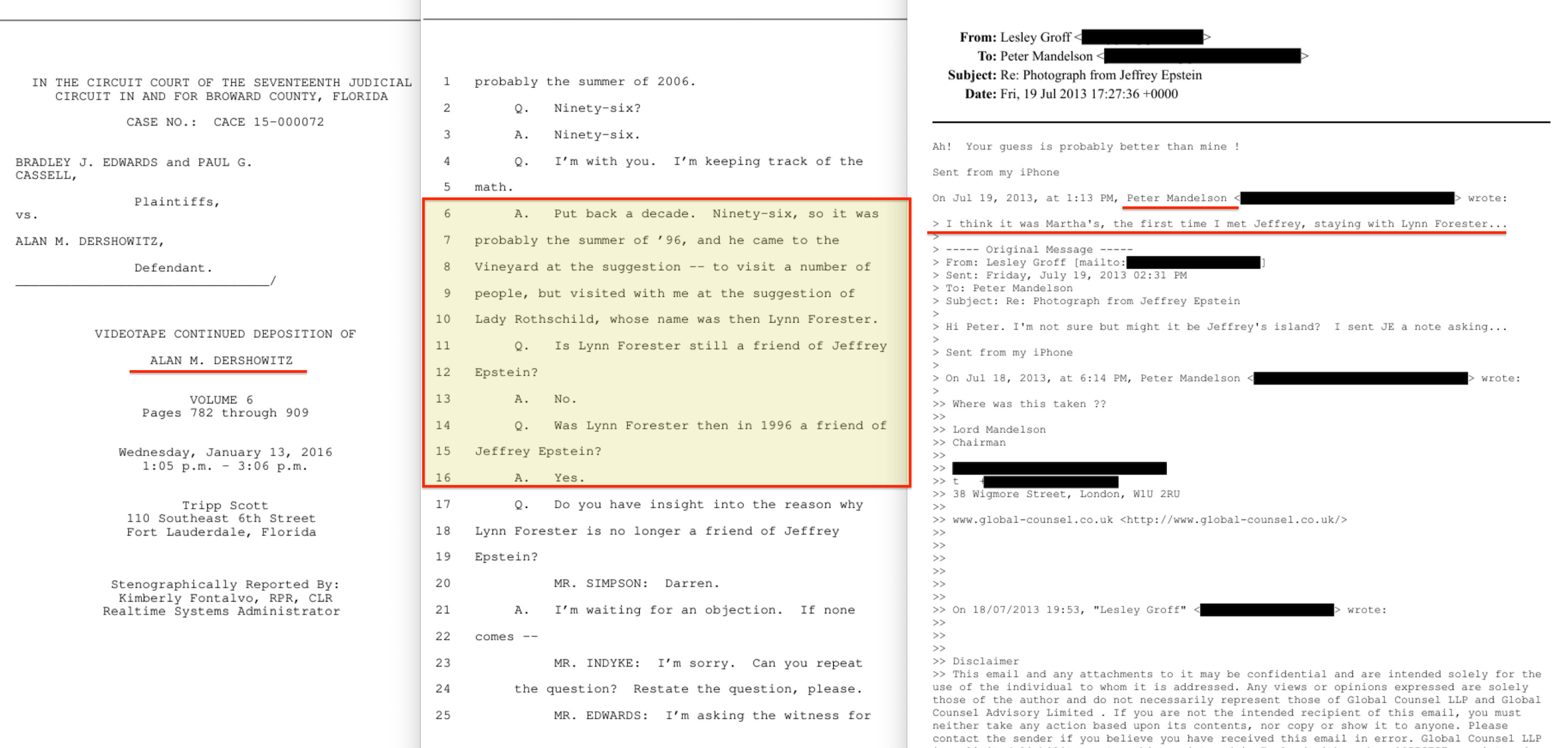 Deposition testimony released by the DOJ confirms that Epstein visited Martha’s Vineyard in the summer of 1996 ‘at the suggestion of Lady Rothschild, whose name was then Lynn Forester‘70. A July 2013 email from Peter Mandelson — the former Labour cabinet minister and European Commissioner for Trade — recalled first meeting Epstein while ‘staying with Lynn Forester‘71.