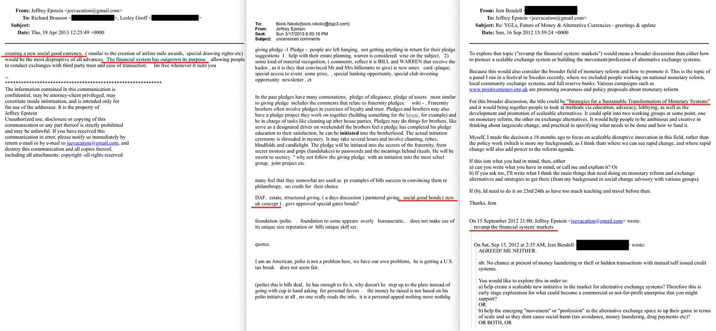And it scaled. In a single email to Nikolic in March 2013, Epstein listed the full stack230: ‘DAF, estate, structured giving, partnered giving, social good bonds, govt approved special gates bonds’. From charitable currency units at the transaction level, through social good bonds at the debt level, to donor advised funds at the asset level — the same label, applied across every layer of the financial system.
