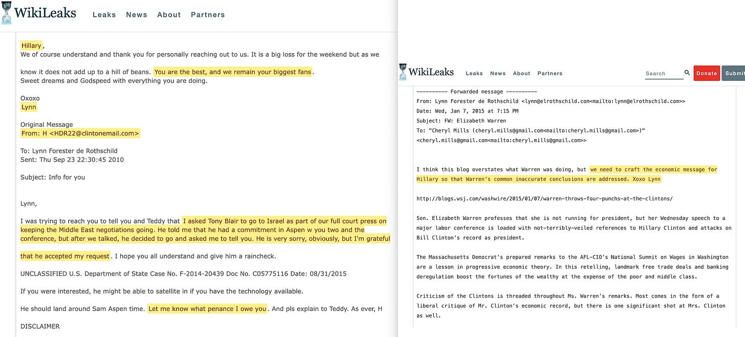 The relationship between Forester and the Clintons stayed close for decades. In September 2010, Hillary Clinton — who was by then Secretary of State — emailed Forester to apologise for pulling Tony Blair away from a Rothschild event in Aspen so he could go to Israel for Middle East peace negotiations. ‘Let me know what penance I owe you‘, Clinton wrote88.