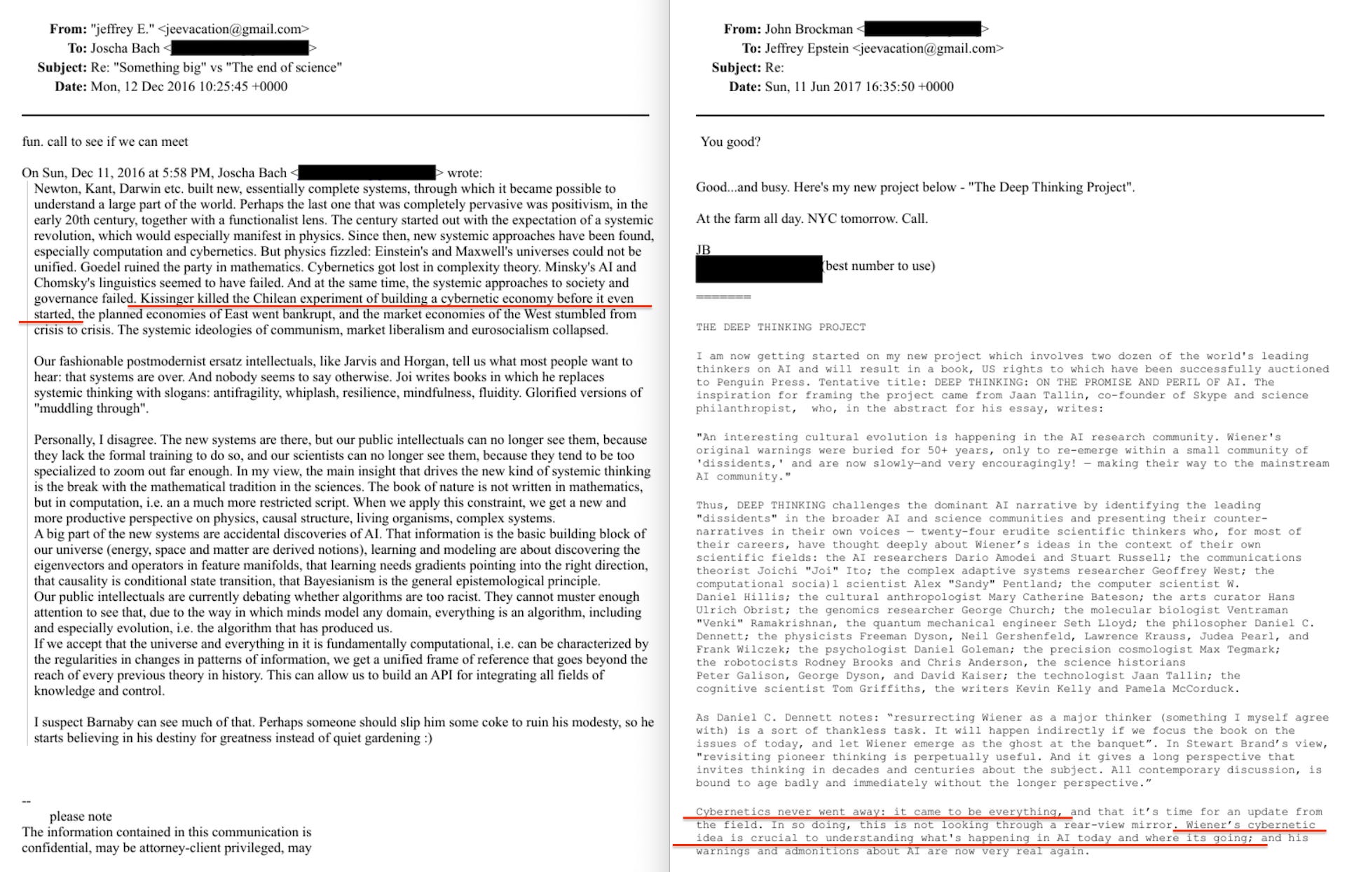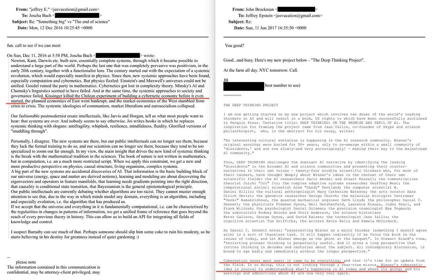 In December 2016, Joscha Bach — an AI researcher funded by Epstein — emailed Epstein a long assessment of how to govern whole systems. In it, he wrote that ‘Kissinger killed the Chilean experiment of building a cybernetic economy before it even started’34. He was talking about Project Cybersyn.