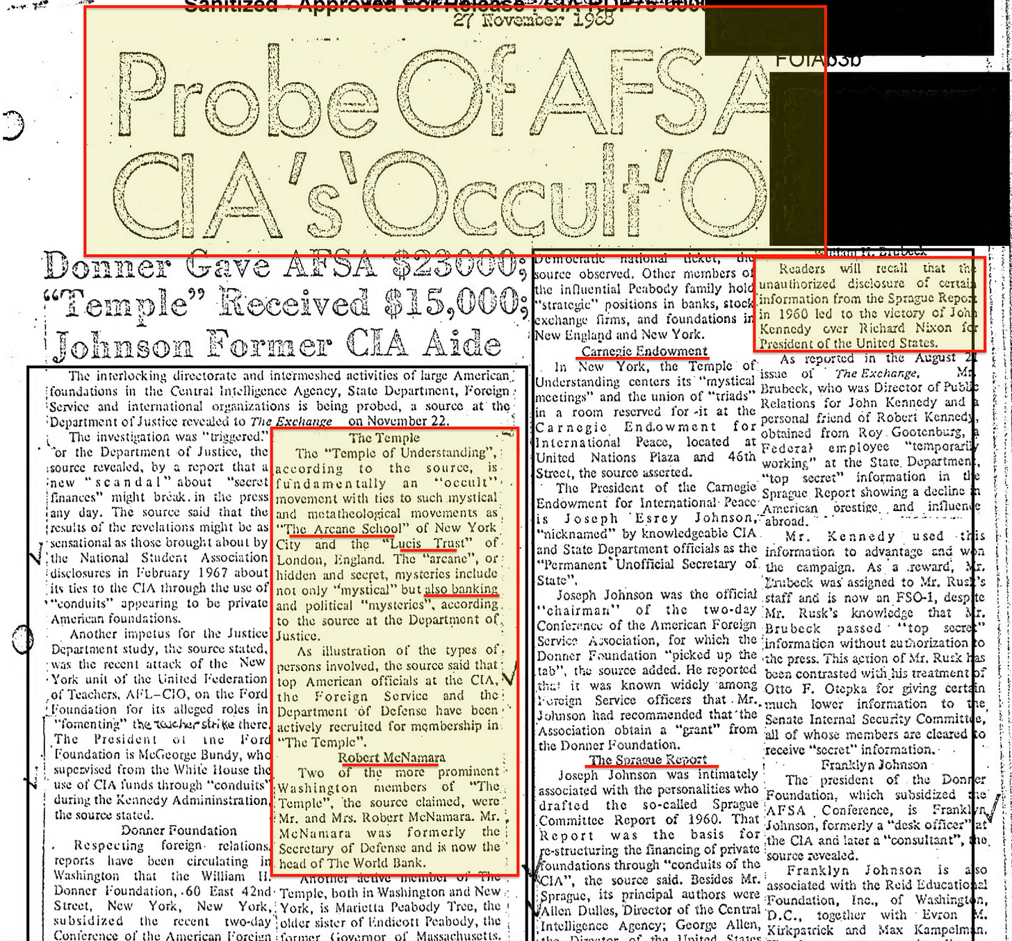 More significantly, the document names specific high-level officials as Temple members: Robert McNamara (Defence Secretary, then World Bank President), Marietta Peabody Tree (UN Ambassador), and 'top American officials at the CIA, the Foreign Service and the Department of Defence'. The Temple received foundation funding and operated from offices in both Washington and New York, functioning as an intermediary between occult organisations and governance institutions.
