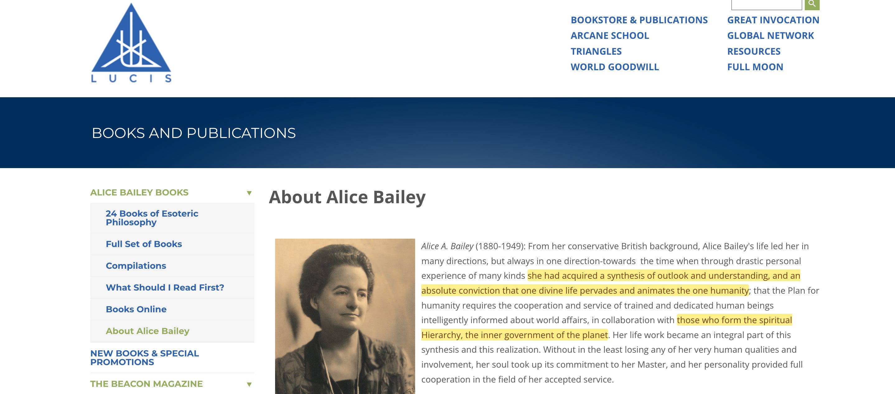 Alice Bailey built upon this foundation but transformed its application. Breaking from the main Theosophical Society in the 1920s, Bailey founded the Arcane School and systematised Blavatsky's individualistic satanism into collectivist Luciferianism3. Where Blavatsky had promoted individual rebellion for personal spiritual gratification, Bailey promoted organised rebellion through institutional channels — what she called the 'externalisation of the hierarchy'4.