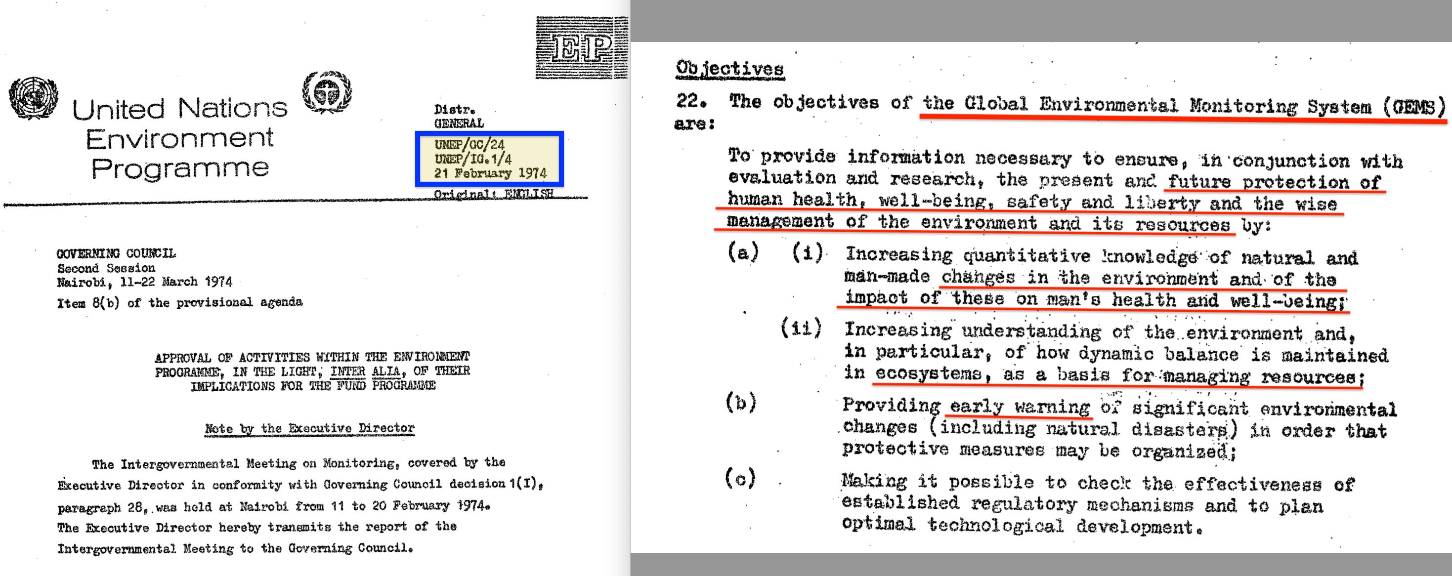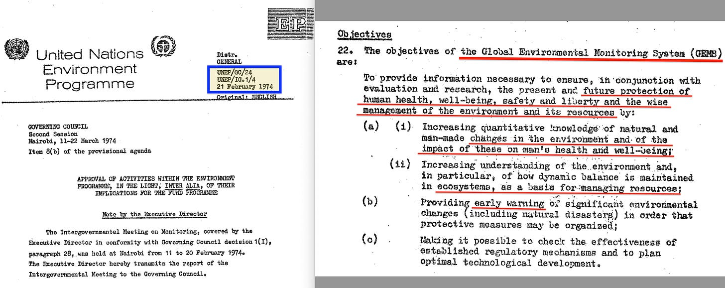 Within months of signing the treaty, UNEP GEMS was built. In 1973, Viktor Kovda became president of SCOPE, who published their ‘action plan’ blueprint for the Global Environmental Monitoring System (GEMS), detailing how to monitor air, water, climate, and ecosystems worldwide in impressive detail.