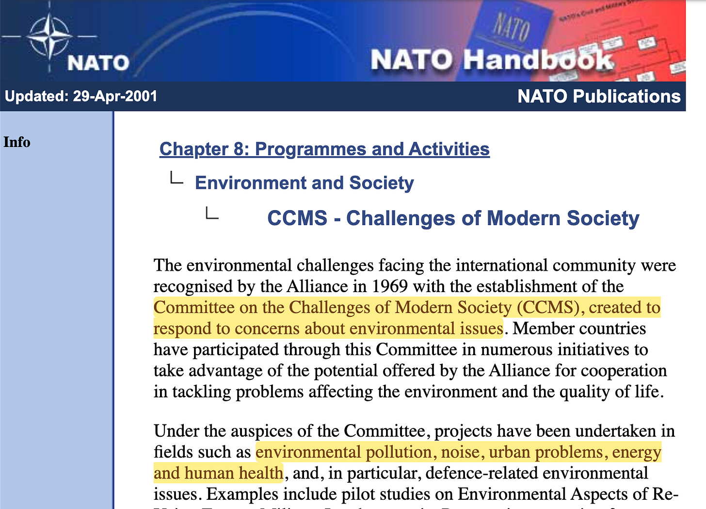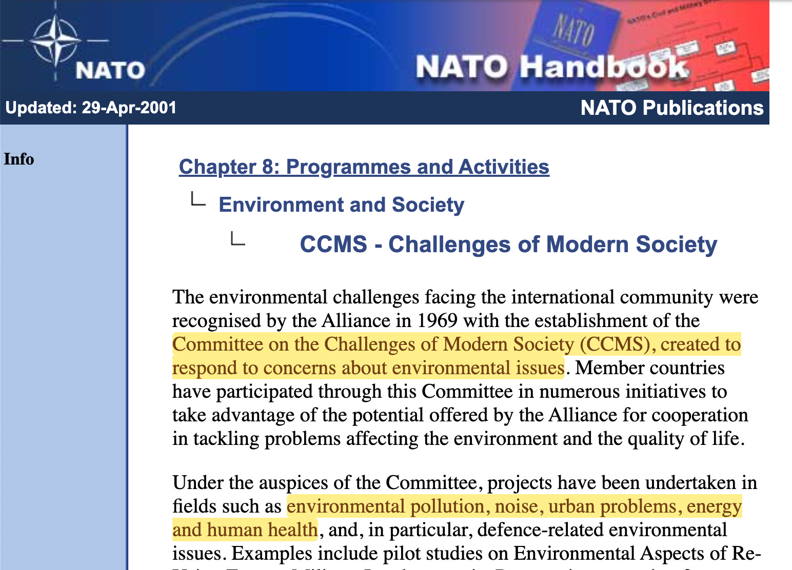 Within months, Nixon12 established the 'NATO Committee on the Challenges of Modern Society' with Moynihan as its head13. The committee's mission? Global environmental monitoring in the name of protecting the planet14.
