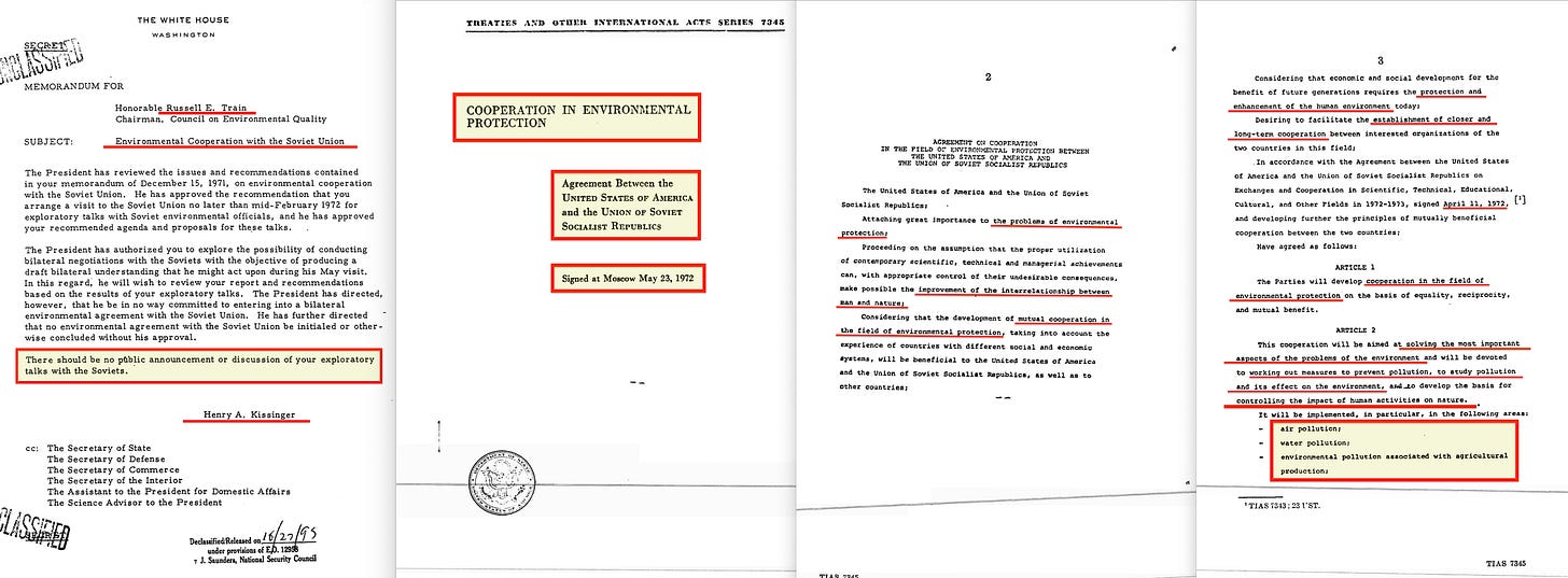 The 'US–USSR Agreement on Cooperation in the Field of Environmental Protection'3 —signed between two supposed ideological opposites — has been almost completely ignored by historians. Yet, buried in government archives is a paper trail that reveals that members of the Cold War's biggest enemies were quietly working together to build the technocratic system we live under today.