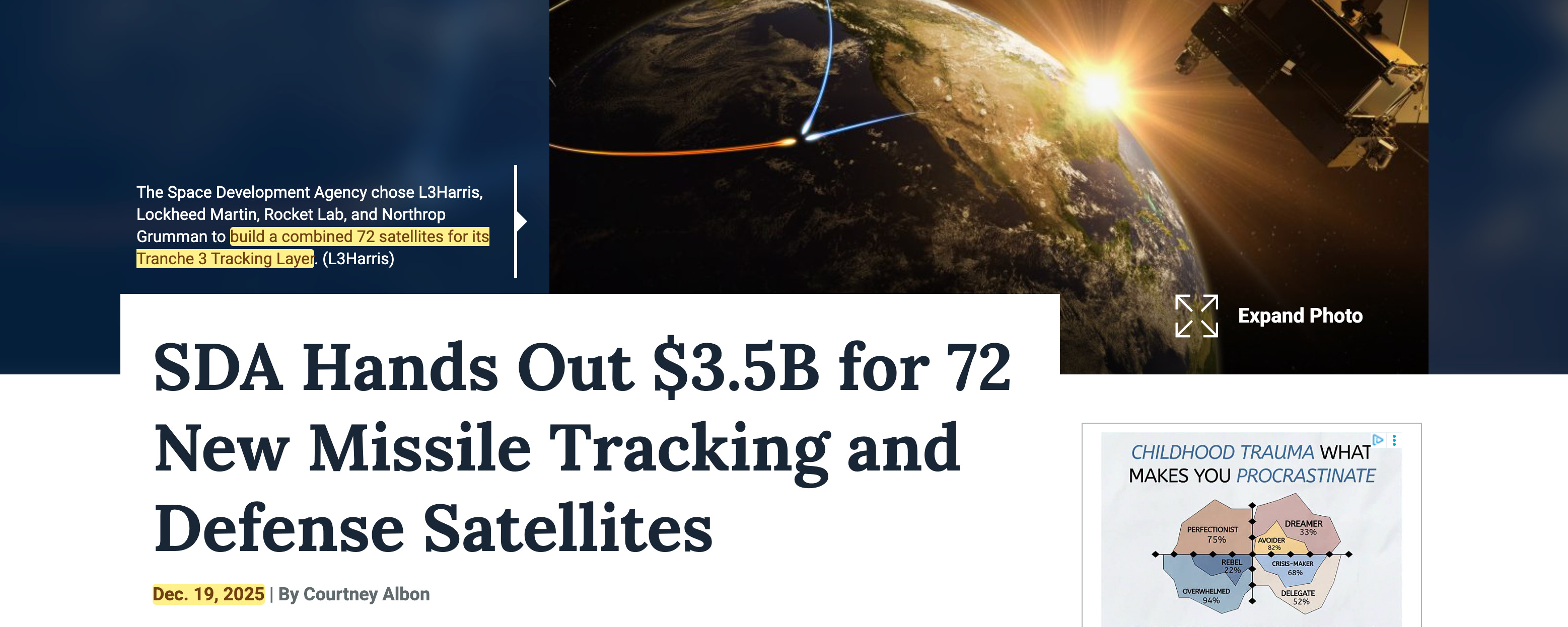 Space Development Agency contract awards for Tranche 3 Tracking Layer36 — structured to deliver and operate 18 satellites per awardee — show the state buying higher ‘frame rate’ perception as an operational baseline37. This is procurement as perception: the inputs to the modelling layer are being provisioned in parallel with the compute, the platforms, and the actuation mechanisms.