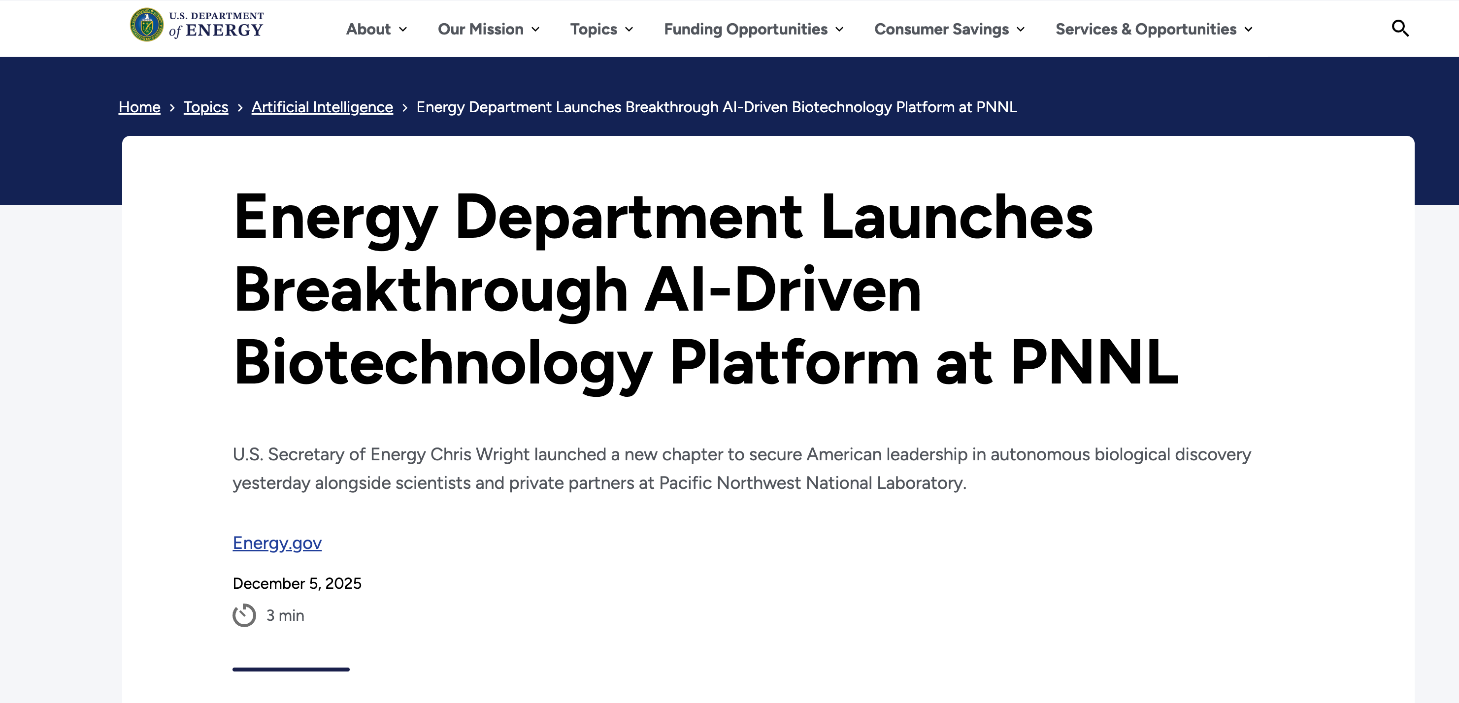 The Genesis EO’s Section (e) — directing review of ‘robotic laboratories and production facilities with the ability to engage in AI-directed experimentation and manufacturing’ — is not waiting for the 240-day review timeline23. The infrastructure is being commissioned in parallel: Secretary of Energy Chris Wright commissioned the Anaerobic Microbial Phenotyping Platform at Pacific Northwest National Laboratory within weeks of the announcement — ’the world’s largest autonomous-capable science system’24.