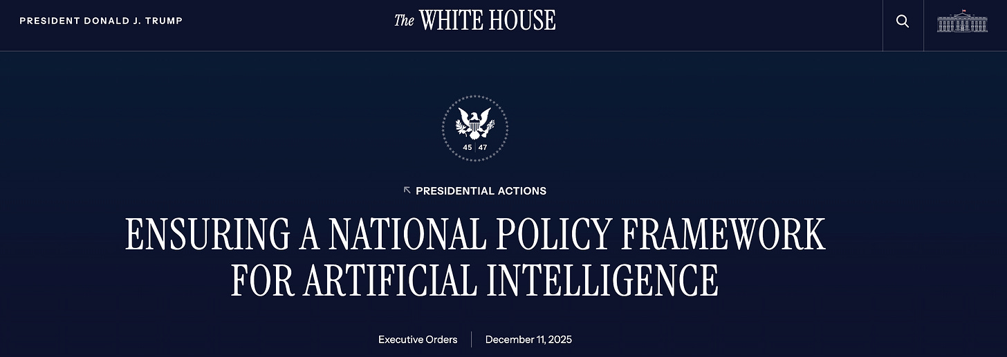 Preemption: ‘inconsistent with national AI policy’, ’eligibility conditions’, ‘fragmenting innovation’
