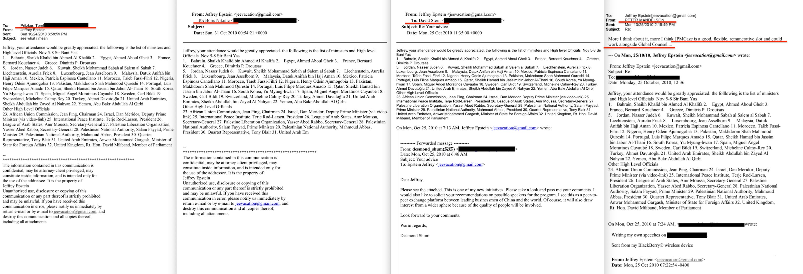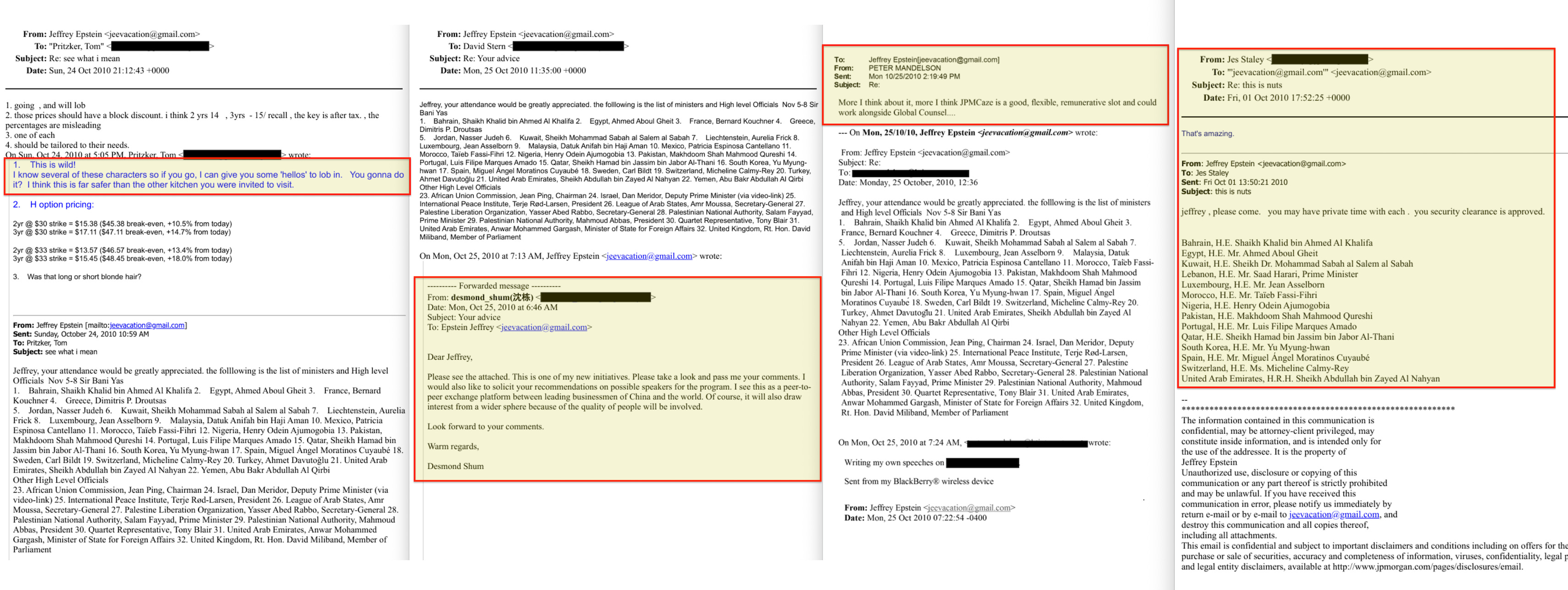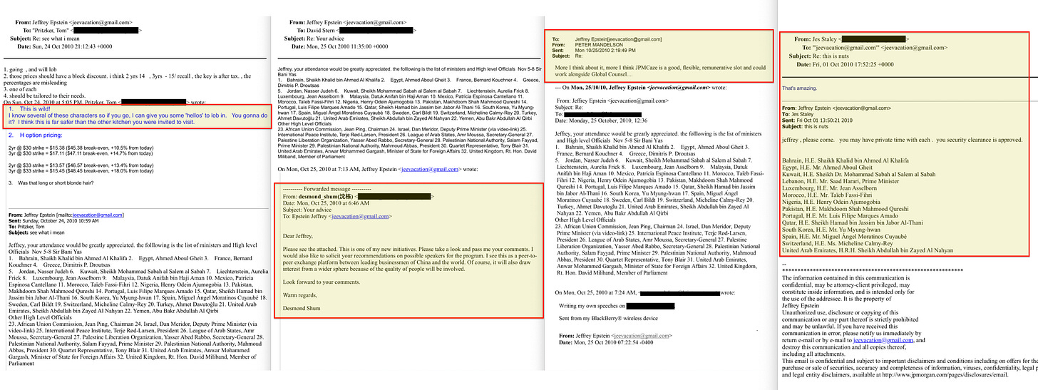 In a second chain52, the same attendee list went to David Stern alongside a proposal from Desmond Shum for a China platform. Two operations routed through one email: the sovereign contact list and a Chinese commercial opportunity, dispatched to the same recipient simultaneously.