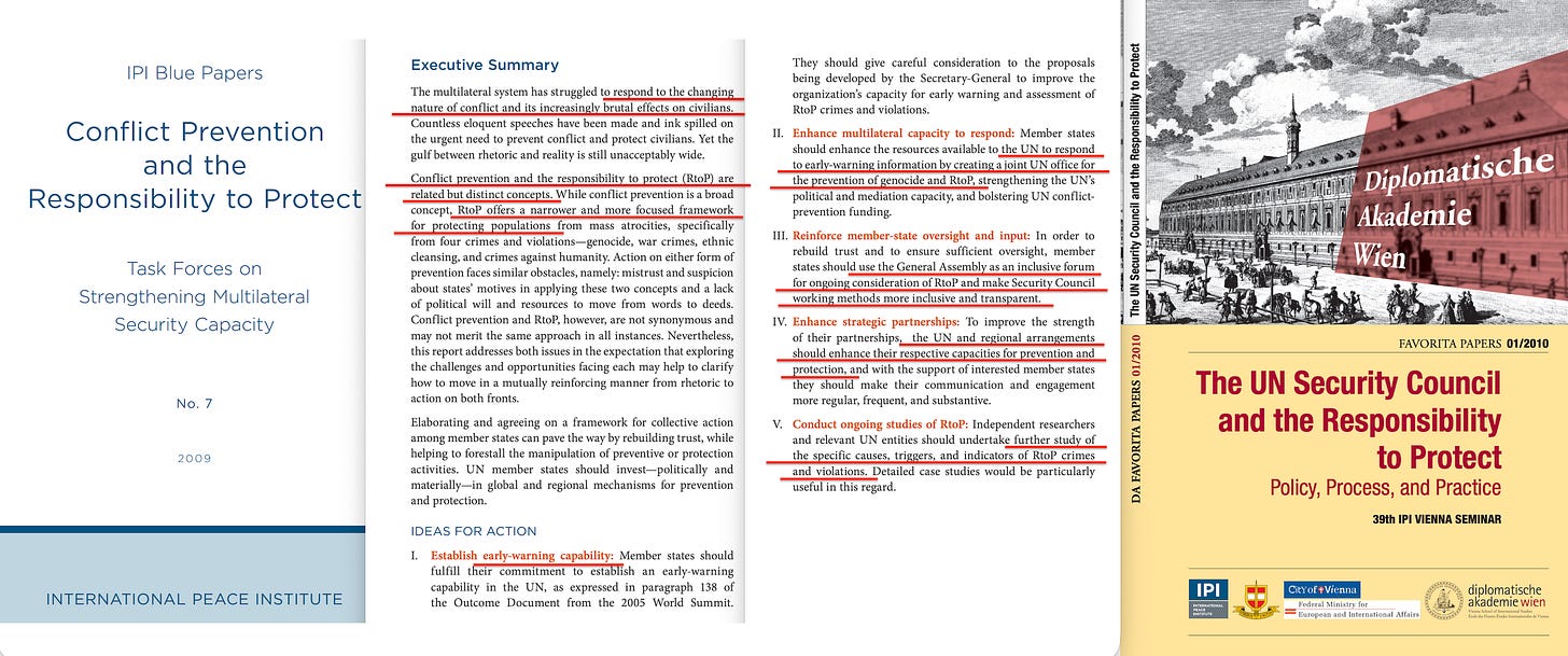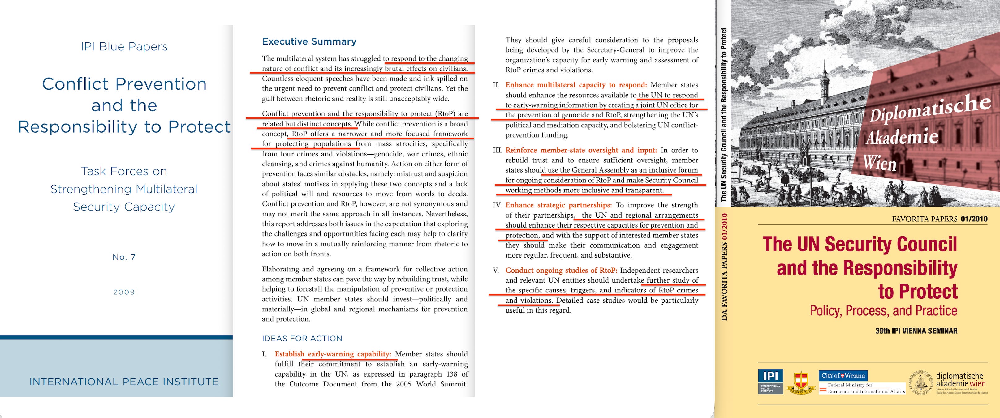 IPI published the Blue Papers, and hosted the Vienna seminars. IPI’s Senior Vice President, Edward C. Luck, simultaneously served as the UN Secretary-General’s Special Adviser on R2P. In March 2011 — four months after the inaugural forum — R2P was invoked to justify NATO’s intervention in Libya71. IPI’s Favorita Paper on R2P and the Security Council was published72, as IPI’s own website notes, ‘shortly after’ the Libya resolution.