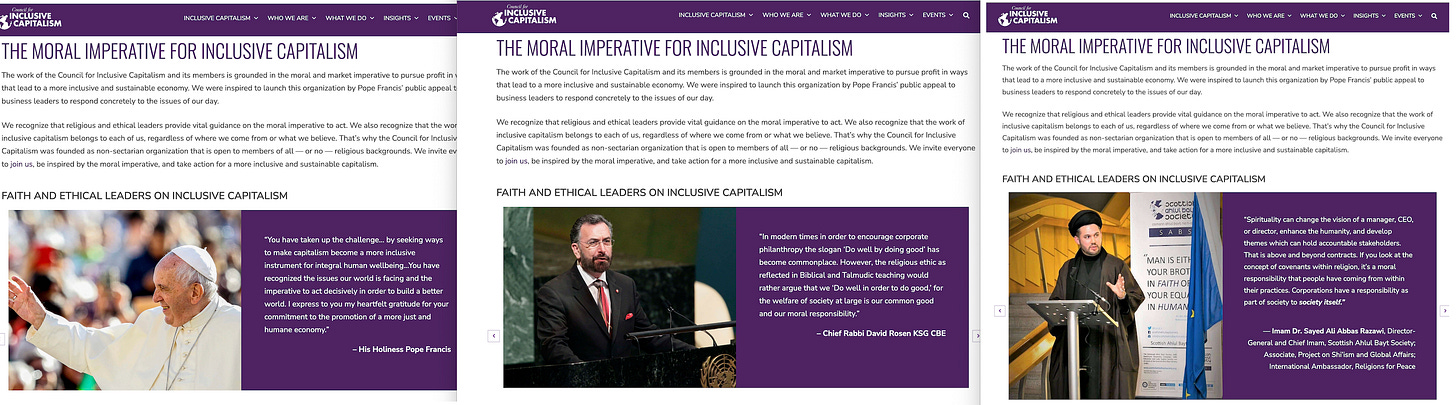 Twenty-six years later, Lynn Forester de Rothschild — wife of Sir Evelyn — founded the Council for Inclusive Capitalism with the Vatican. At its December 2020 launch, CalPERS CEO Marcie Frost stated that ‘sustainable value creation rests on stewardship, not only of financial capital, but human and natural capital.’ The Rockefeller Foundation is a council member. Mark Carney, the former Governor of the Bank of England who developed the TCFD climate disclosure framework, is a prominent participant.