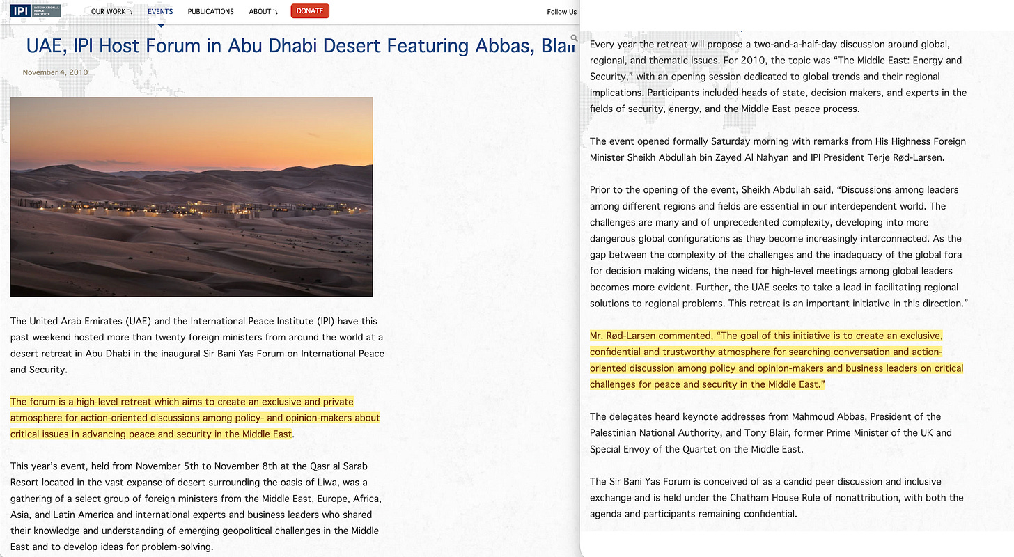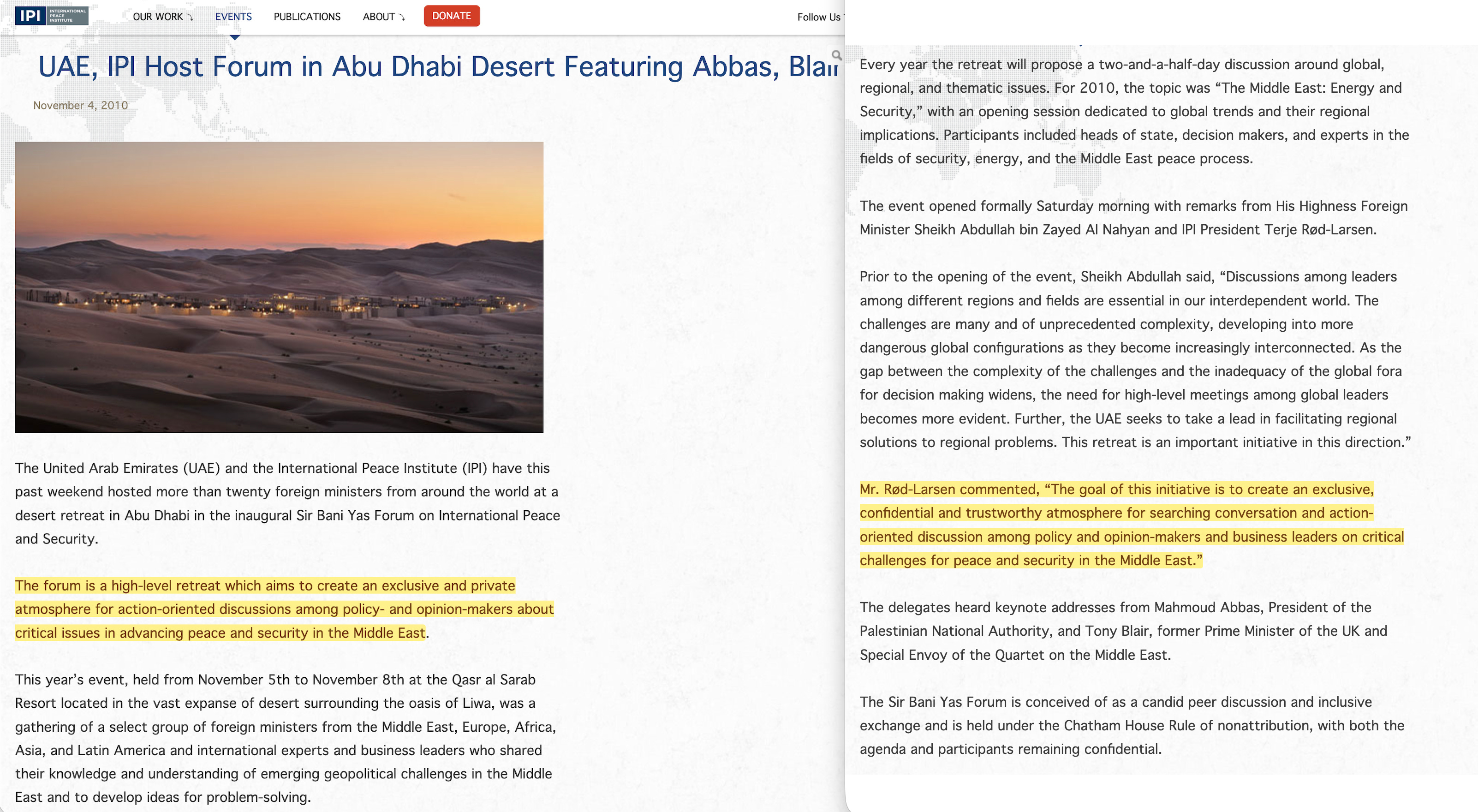 Sheikh Abdullah bin Zayed was the figurehead — the sovereign host, the reason foreign ministers accepted the invitation. A summons from the UAE’s foreign affairs minister carries the weight of state authority. But the invitation list, the agenda, the panel composition, the follow-up — the selection function — was managed through IPI. And IPI was Rød-Larsen’s institution.