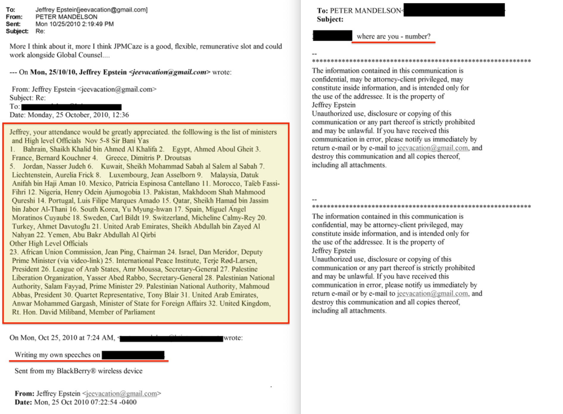 The following day, Epstein forwarded the list to Peter Mandelson4. The email to Mandelson begins with a redacted name and the question: ‘where are you - number?’ Mandelson was otherwise occupied: ‘Writing my own speeches on [redacted]’.