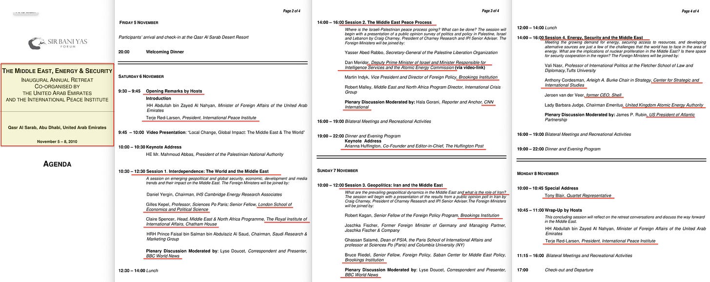 The final morning — Monday 8 November — featured a Special Address by Tony Blair as Quartet Representative, followed by a wrap-up delivered jointly by Sheikh Abdullah bin Zayed and Rød-Larsen. Then: ‘Bilateral Meetings and Recreational Activities’ from 11:15 until departure at 17:00. Nearly six hours of unstructured bilateral time on the final day alone.