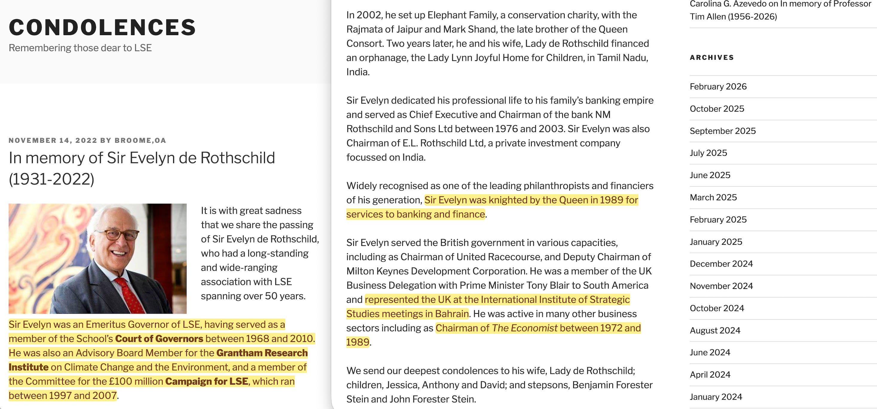 Evelyn de Rothschild was personal financial adviser to Queen Elizabeth II, knighted in 1989 for services to banking and finance61. He had the cross-network position that neither Philip nor Hassan possessed independently. The person who ‘joined’ is, on the structural evidence, the person who constituted the initiative — selecting the figureheads, and then stepping into the record as a supporter rather than the architect.
