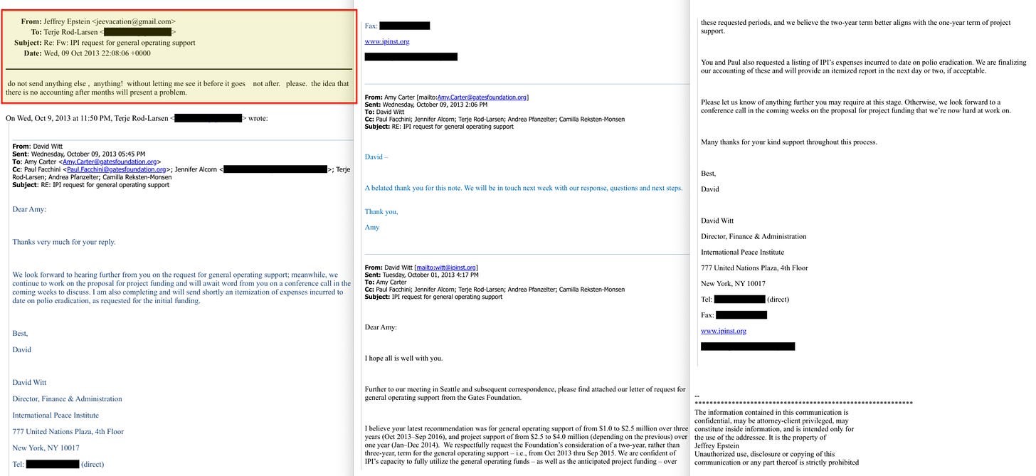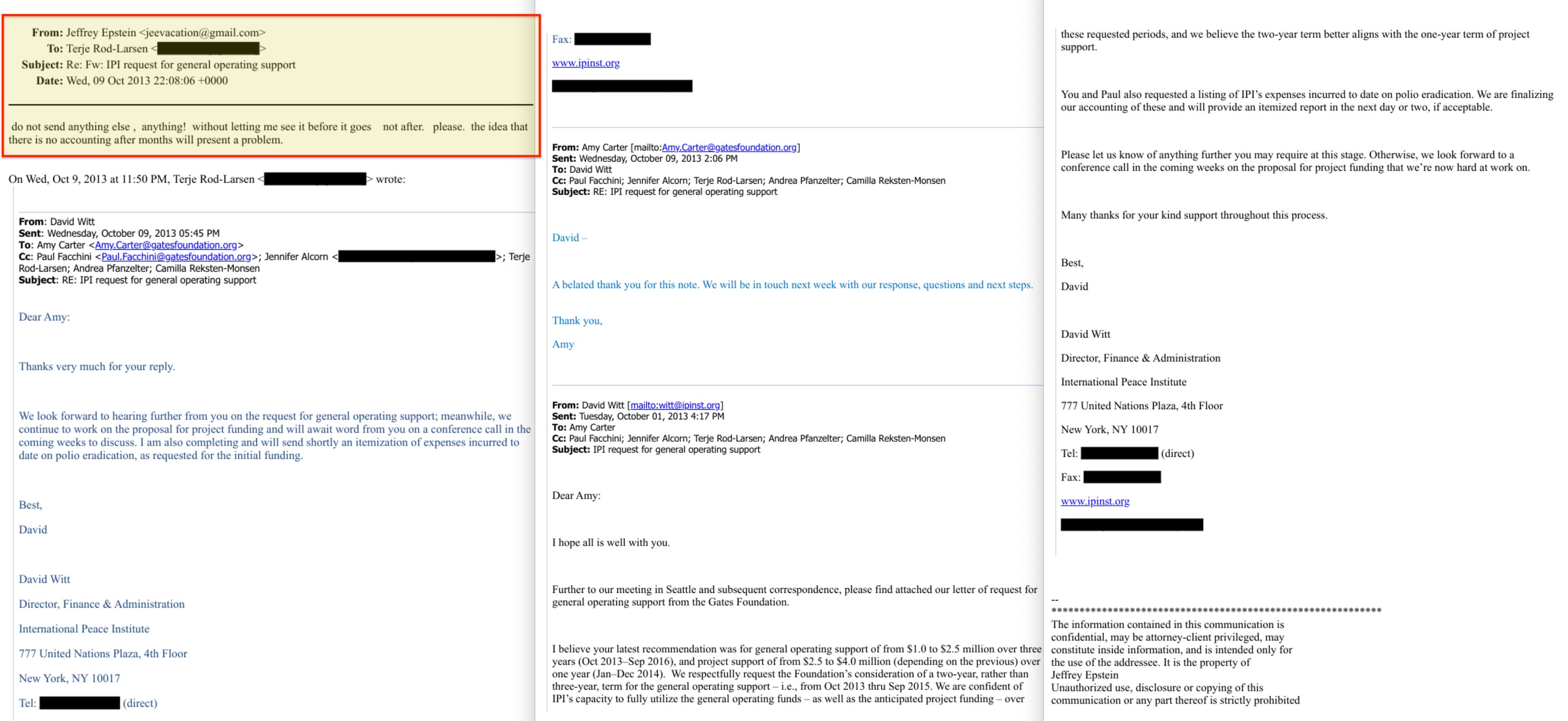 The relationship went beyond funding. When Rød-Larsen forwarded IPI’s grant correspondence with the Gates Foundation, Epstein demanded39: ‘do not send anything else, anything! without letting me see it before it goes not after’.