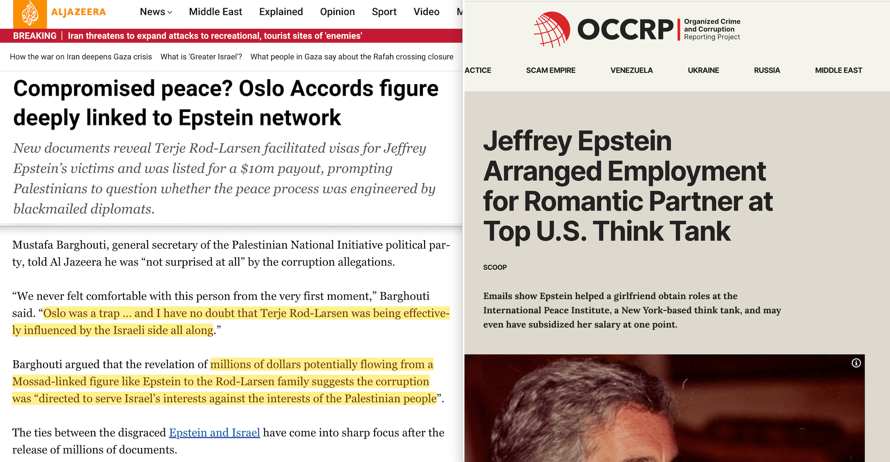 Meanwhile, documents from the critical period of the Oslo Accords negotiations — January to September 1993 — are missing from the official Norwegian Foreign Ministry archive46. Rød-Larsen maintained a private archive covering these negotiations. Palestinian officials have publicly questioned whether the peace process was compromised. Mustafa Barghouti, general secretary of the Palestinian National Initiative, told Al Jazeera47: ‘Oslo was a trap... and I have no doubt that Terje Rød-Larsen was being effectively influenced by the Israeli side all along’.
