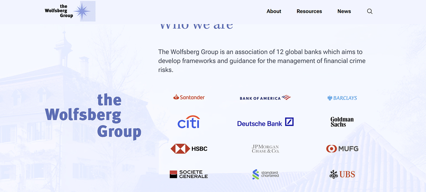 The Wolfsberg Group6 — a consortium of major global banks including JPMorgan, HSBC, Barclays, Deutsche Bank, and UBS — coordinates anti-money laundering standards across the banking sector.