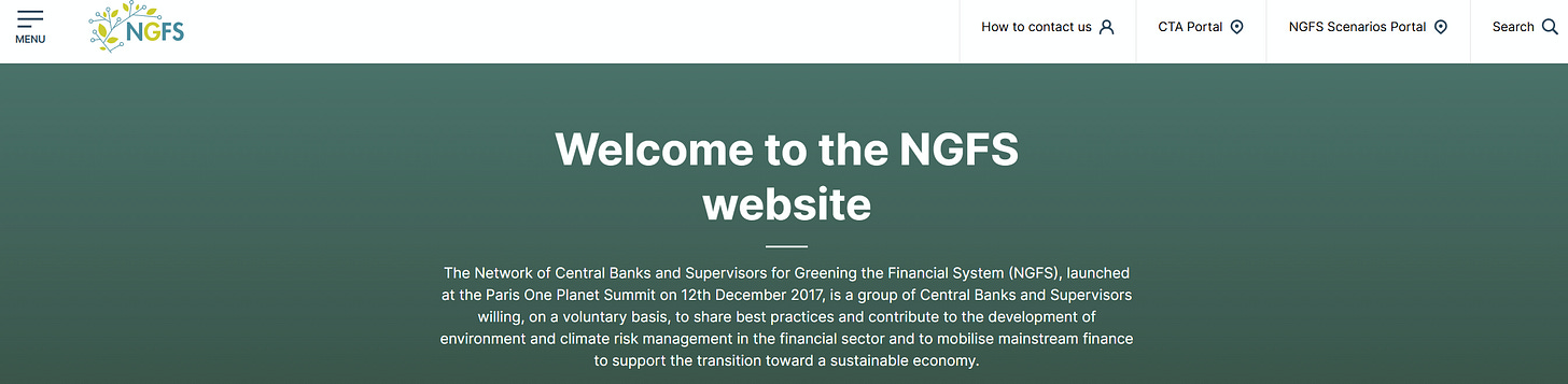NGFS operates within the BIS/FSB ecosystem. Its scenarios inform stress tests, its recommendations shape disclosure requirements, and its definition of ‘climate-related financial risk’ determines what banks must measure and report. The logic: climate change poses risks to financial stability; central banks must preserve financial stability; therefore central banks must address climate change. The mandate expands without any change to underlying law, and risk weights affecting cost are adjusted on the basis of long-term environmental predictions, produced by 'black box' modelling.