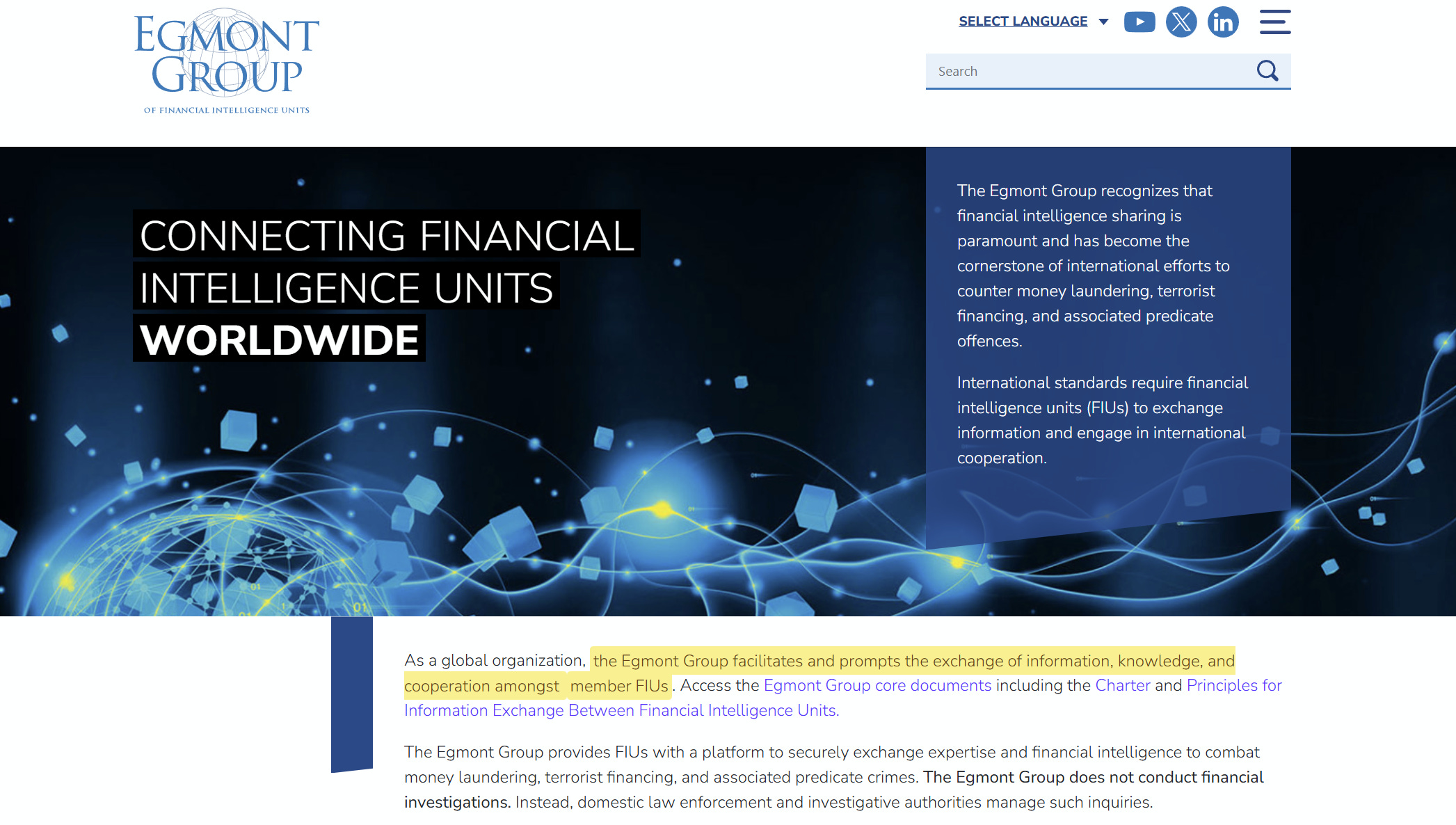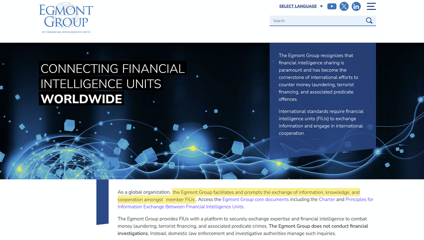 The Egmont Group2 connects a global network of Financial Intelligence Units (FIU)345 — the national agencies that receive and analyse suspicious activity reports. When a bank files a report, it flows to the national FIU. When an FIU identifies a pattern worth sharing, Egmont provides the channel to distribute that intelligence internationally.