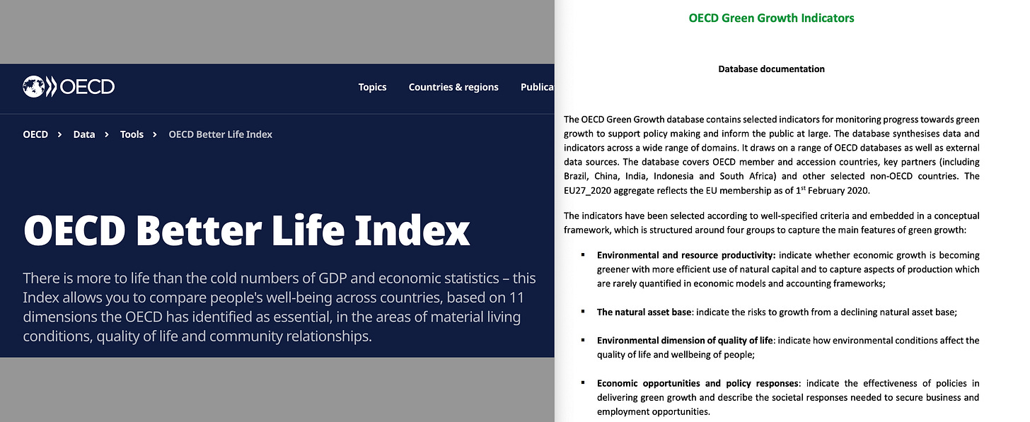 The Ideological Cover: ‘Beyond GDP, well-being for all’. The OECD's expansion beyond economic metrics is positioned as progressive evolution — finally measuring what really matters for human flourishing rather than just economic output. The Better Life Index25, Green Growth indicators26, and Social Progress metrics are framed as tools for creating a more ‘holistic’, human-centered approach to development.