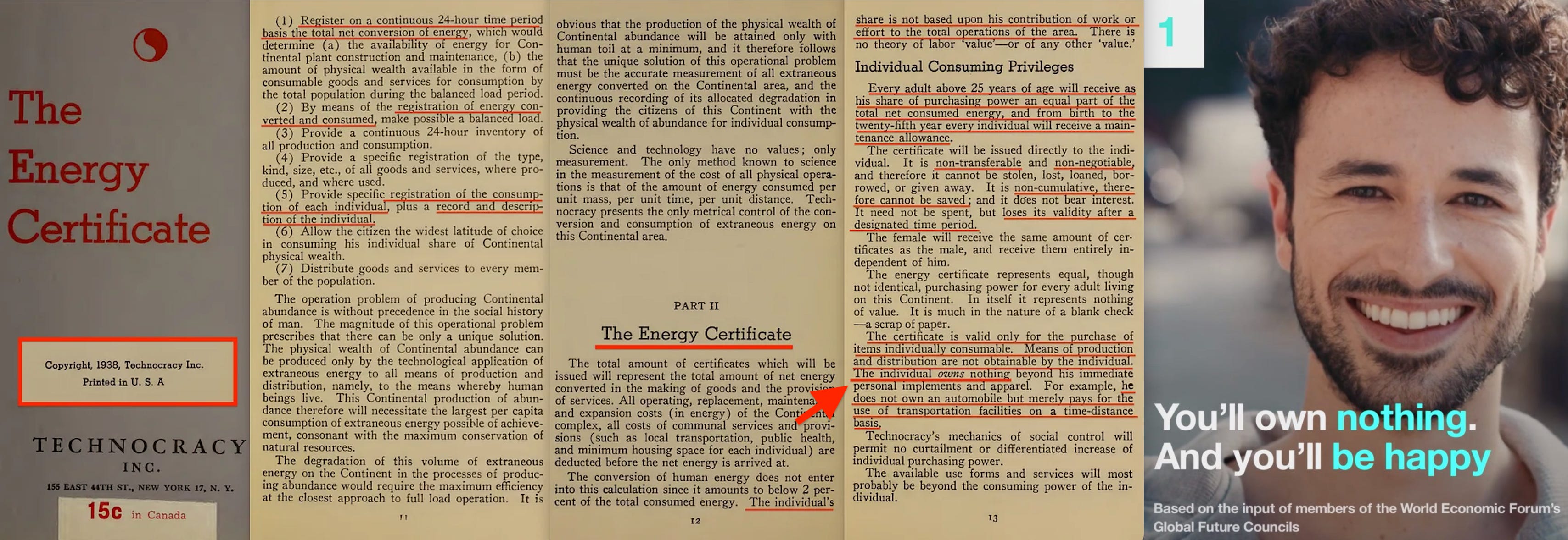 But perhaps we shouldn't be surprised by any of this. In 1936, Technocracy, Inc. proposed an ‘energy certificate’89 — a radical reimagining of money based on energy units rather than gold or fiat currency. The document made one thing patently clear: