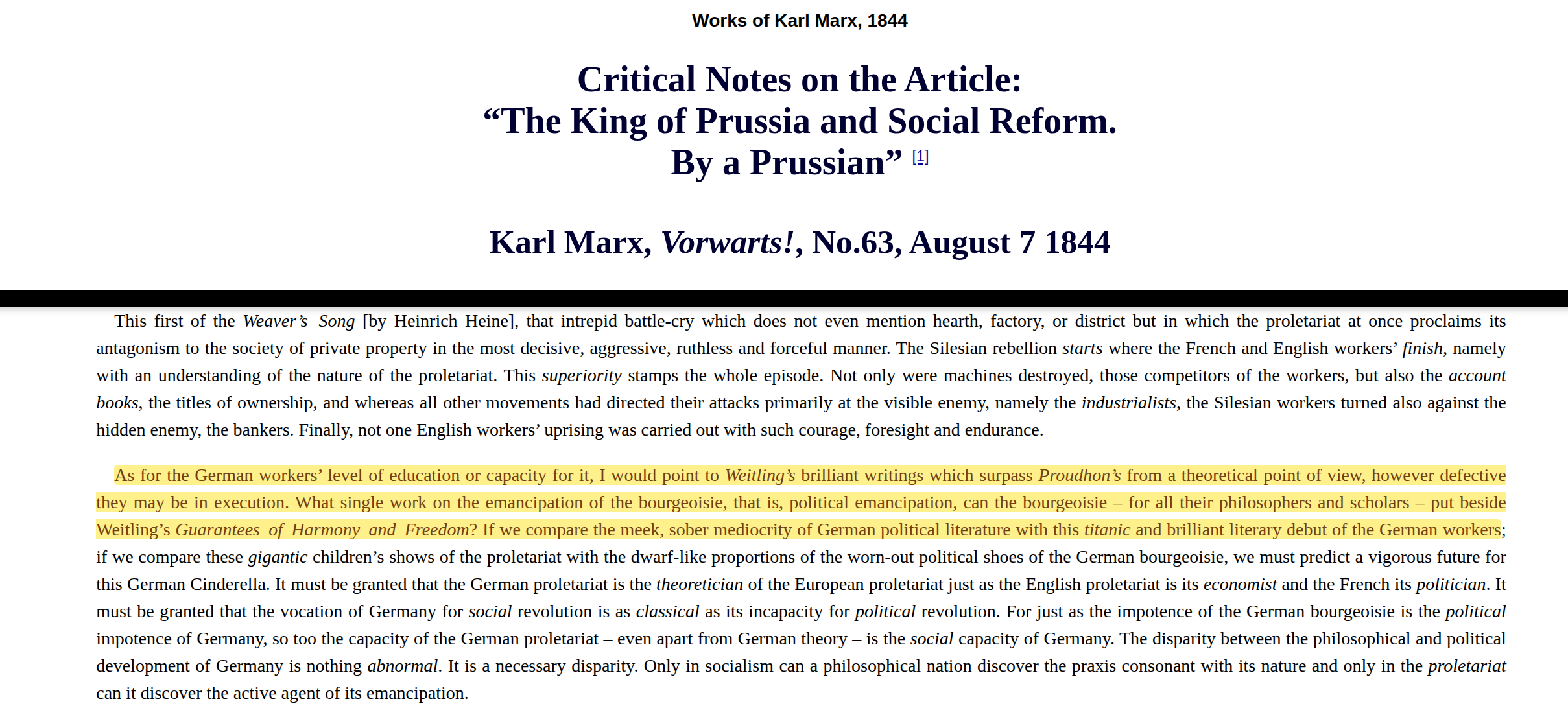 The Brussels Committee's most significant early operation targeted Wilhelm Weitling, the League of the Just's most influential theorist14. Weitling had already developed sophisticated critiques of property and money in works like Guarantees of Harmony and Freedom15 (1842), which Marx himself had praised as ‘the brilliant literary debut of German political literature’16. Yet when the two men met in Brussels in spring 1846, Marx's attitude had transformed entirely17.