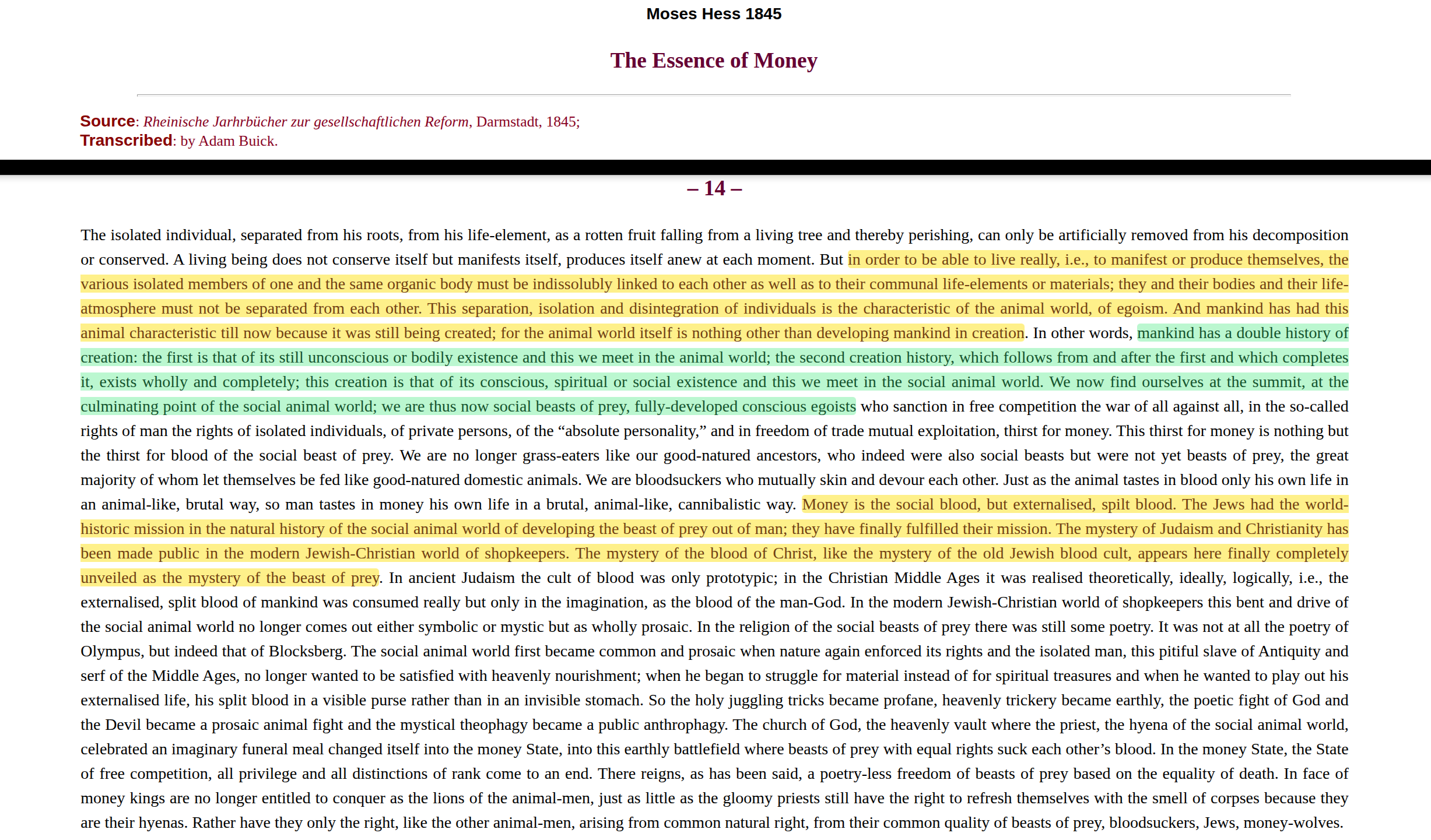 To grasp the ethical foundation of this logic, we can turn to Moses Hess, who had already argued that communism required nothing less than the abolition of selfishness itself. In his 1845 essay The Essence of Money54, Hess called money ‘human value expressed in figures … the mark of our slavery’. For Hess, money embodies egoism itself, transforming every personal desire into a quantified exchange and every relationship into a transaction. Communism, thus, is not simply the end of property but the elimination of ‘selfishness’, the subordination of all private desires to the collective ideal. Independence, in this sense, is pathological, a residue of bourgeois egoism.