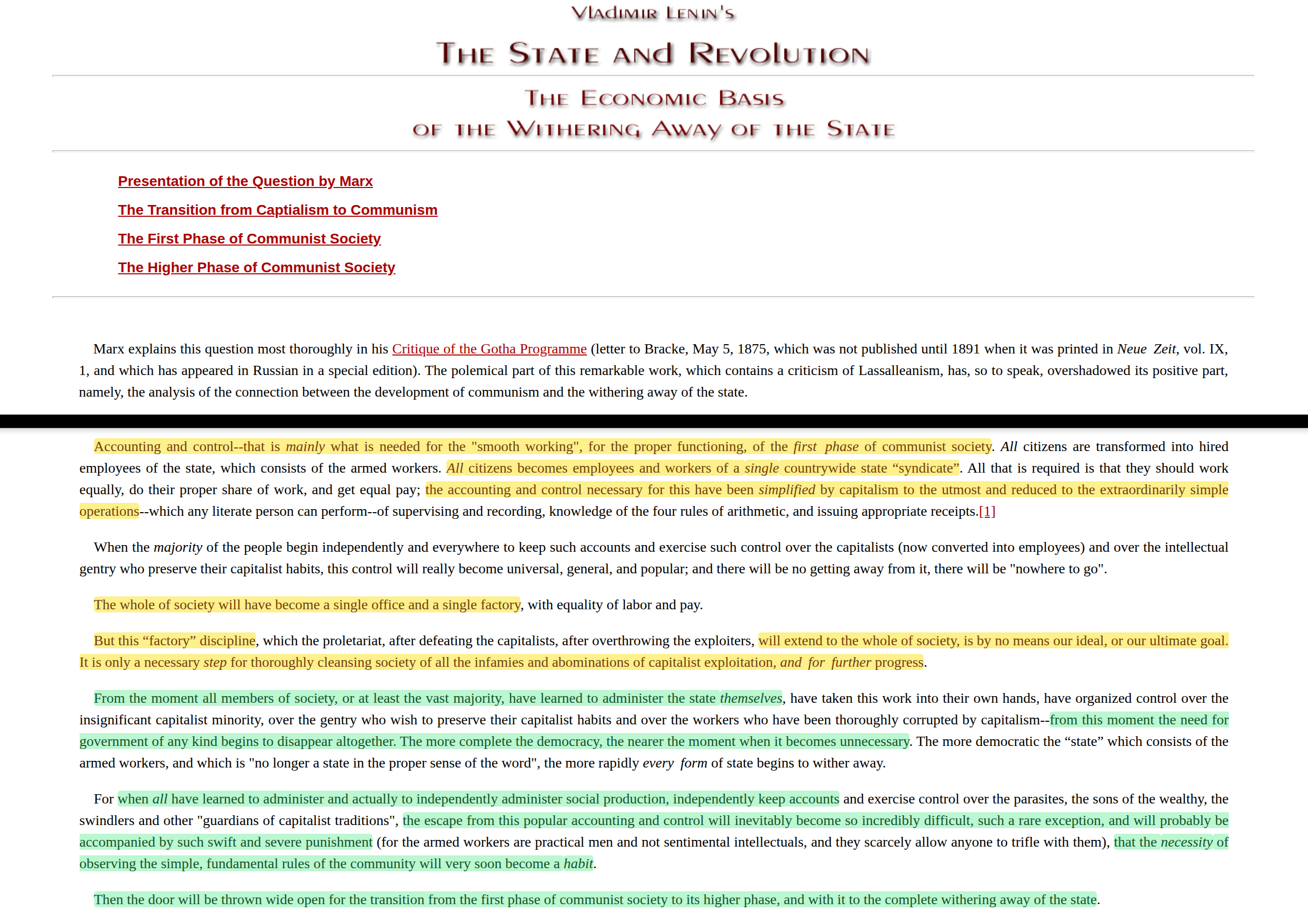 Then the door will be thrown wide open for the transition from the first phase of communist society to its higher phase, and with it to the complete withering away of the state.