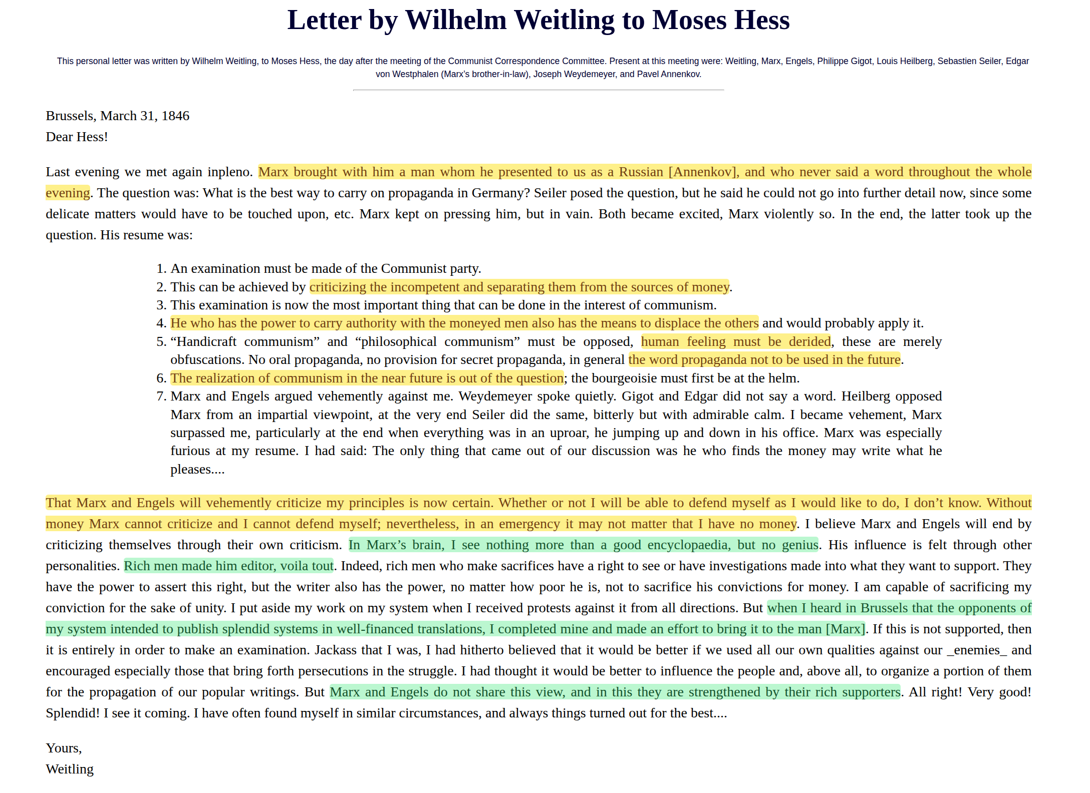 Weitling's letter to Moses Hess on March 31, 184622, provides crucial insight into the dynamics underlying Marx's success. ‘Without money Marx cannot criticise and I cannot defend myself’, Weitling observed, identifying the fundamental imbalance that would determine the outcome of their conflict. While Weitling advocated direct action to ‘influence the people and, above all, to organise a portion of them for the propagation of our popular writings’, Marx opposed this approach to worker organising, being ‘strengthened by their rich supporters’.