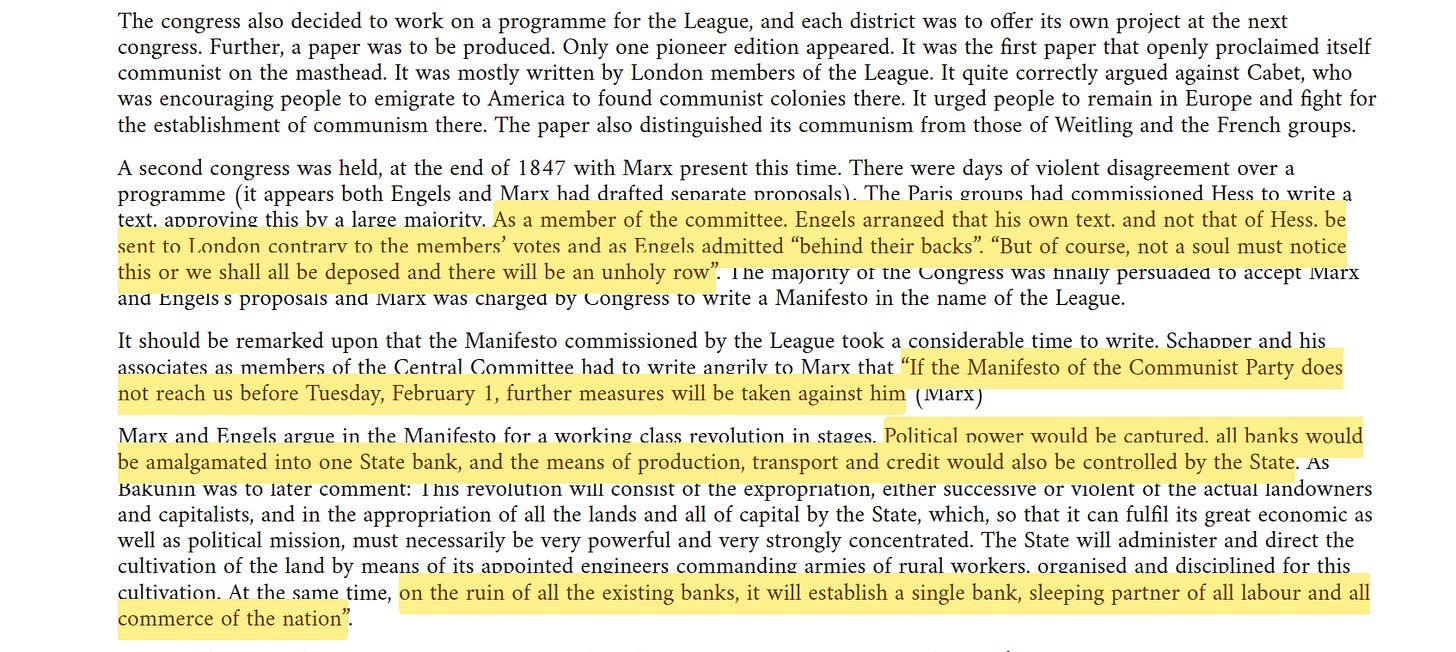 Even after being commissioned to write the Communist Manifesto, Marx required external pressure to complete the task. The Central Committee was forced to issue an ultimatum giving Marx until February 1, 1848, to deliver the text, warning that ‘further measures will be taken against him’ if he failed to meet the deadline41. The Manifesto finally appeared in London in February 184842, not as the organic expression of working-class consciousness, but as a document produced under institutional pressure after systematic elimination of alternative voices.
