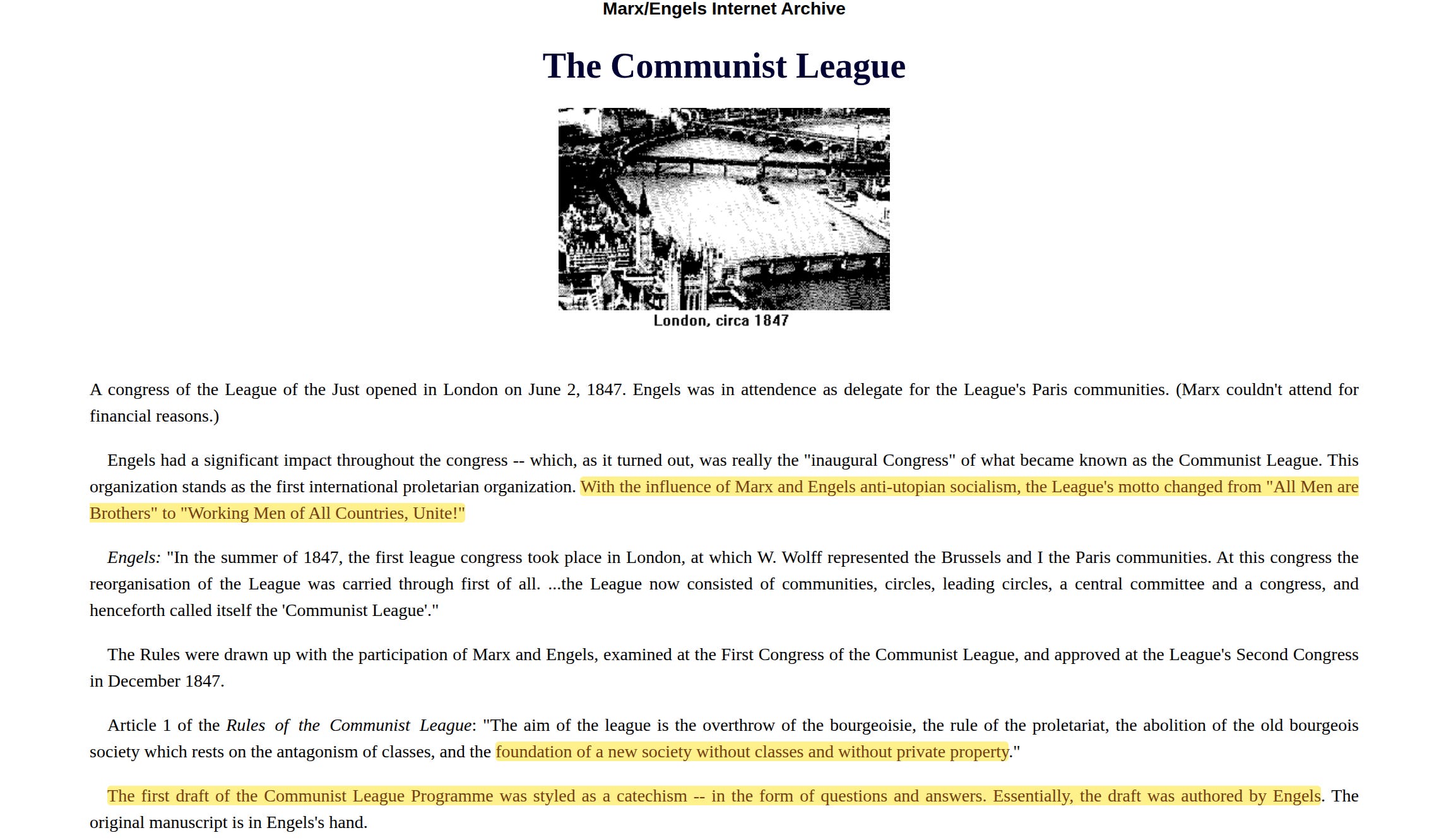 Parallel to organisational centralisation came doctrinal standardisation. Engels drafted two catechisms: the ‘Draft of a Communist Confession of Faith’38 in June 1847, followed by the expanded ‘Principles of Communism’39 in October-November 1847. These documents replaced pluralistic debate with standardised question-and-answer formats, establishing ‘correct answers’ on key theoretical and strategic questions. This served as ideological gatekeeping — allowing the center to determine who possessed adequate theoretical understanding to participate in decision-making.