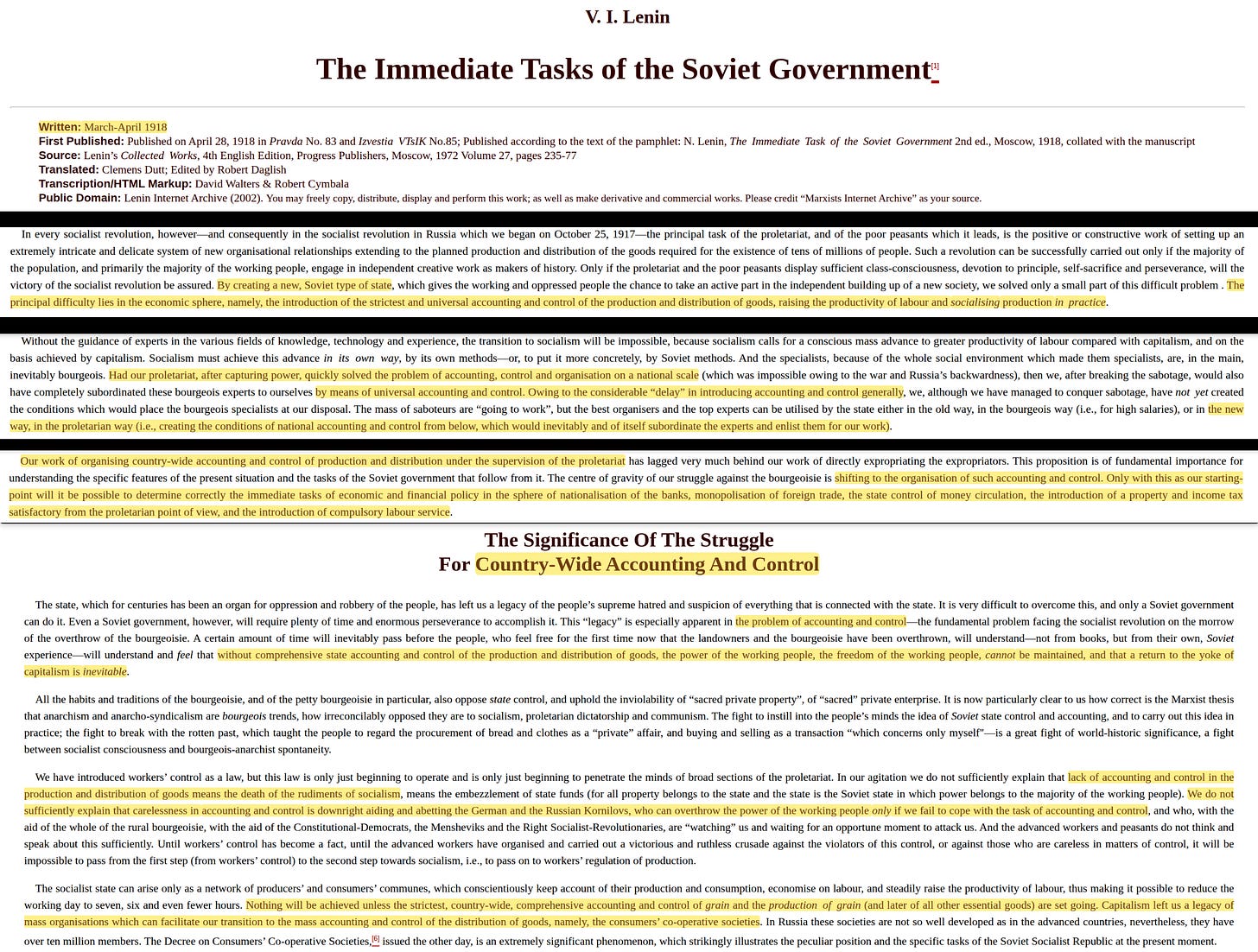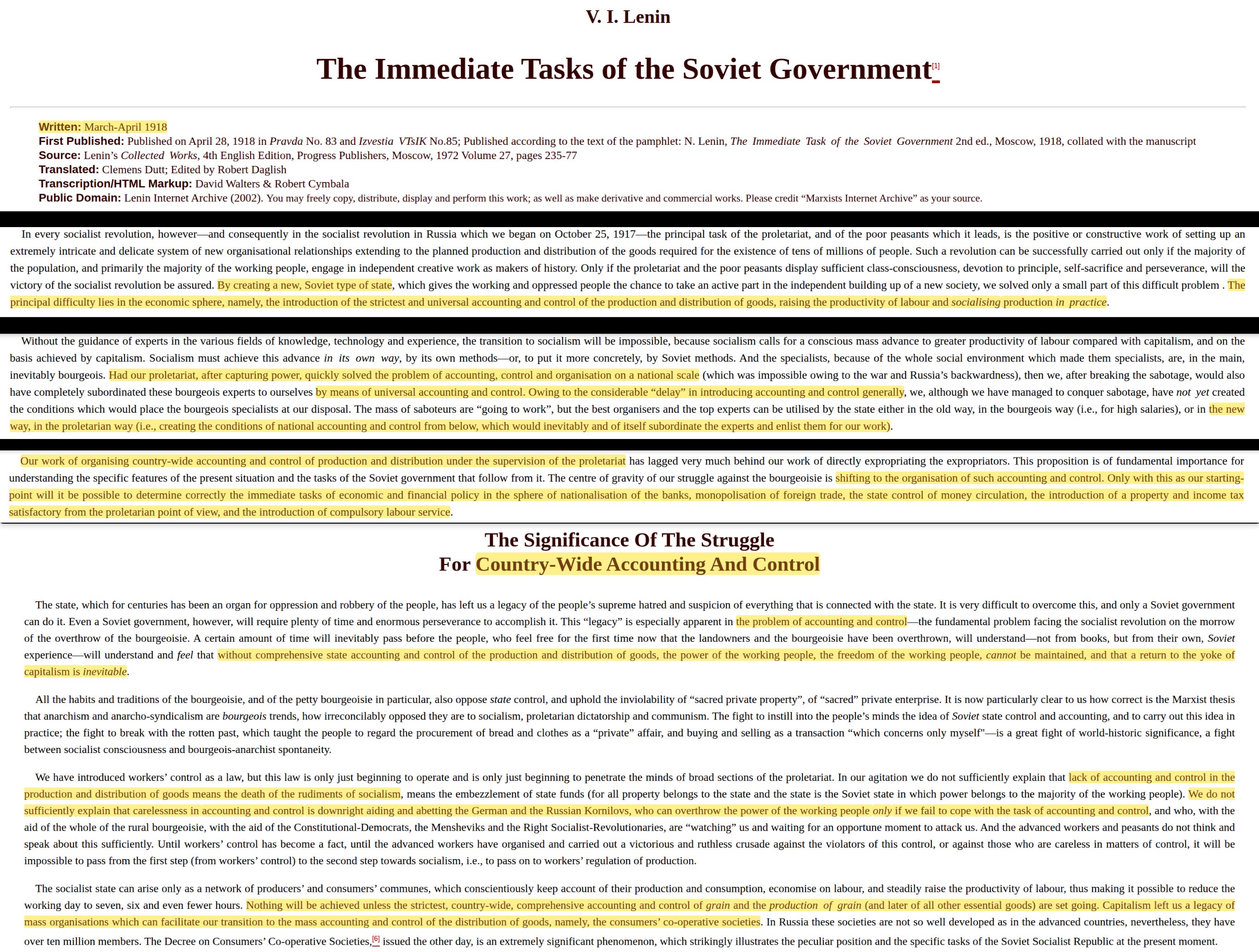 This is not a one-off. In ‘The Immediate Tasks of the Soviet Government’49 from April, 1918, ‘accounting and control’ is repeated throughout, inclusive in mention of economics: