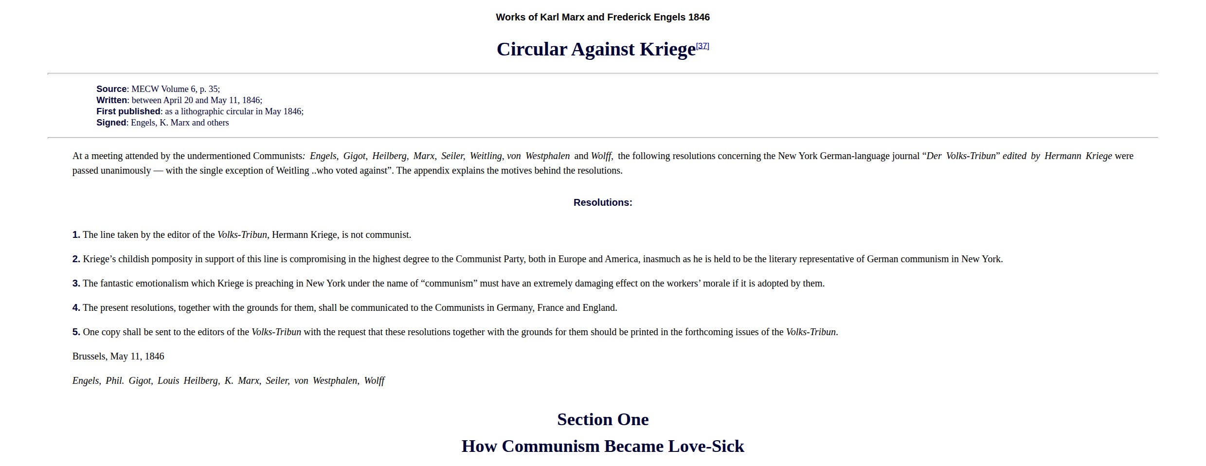 The Committee’s boundary-policing was immediately visible in the Circular against Kriege: Weitling alone refused to sign12, arguing for tactical leeway in America, yet copies were dispatched to England, France, Germany, and the United States and the indictment ran in the Westfälische Dampfboot. Moses Hess sided with Weitling and soon broke with Marx and Engels over the affair13.