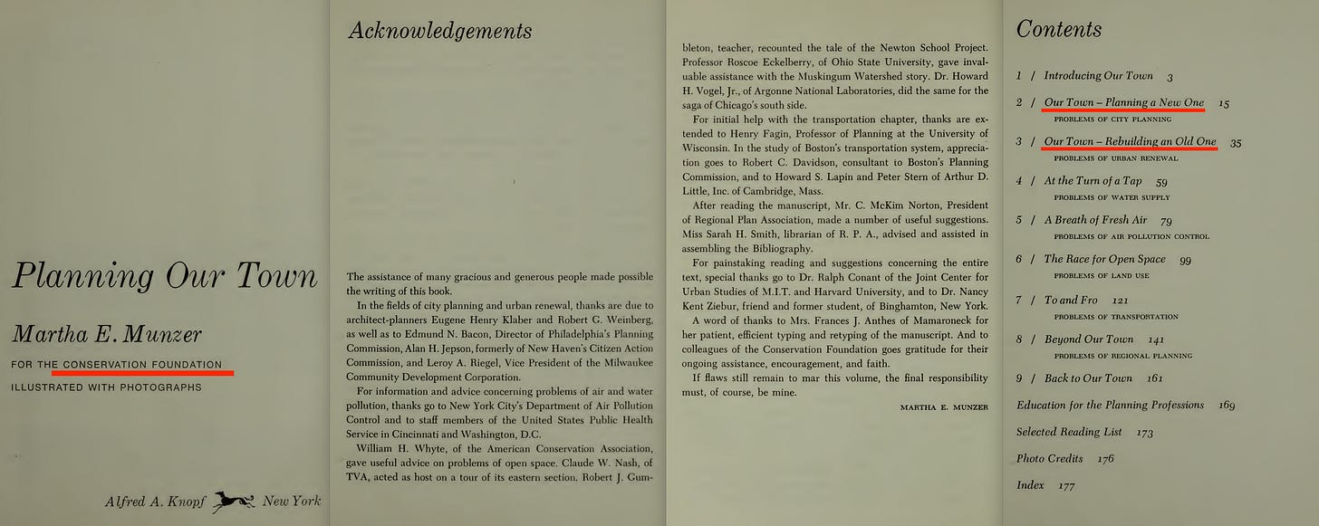 I won’t cover in detail. All aspects of those Conservation Foundation documents appear well considered; through natural resources, to education and the change in institutions called for, through to accompanying laws, the consideration of population, the environment, and finally community planning.
