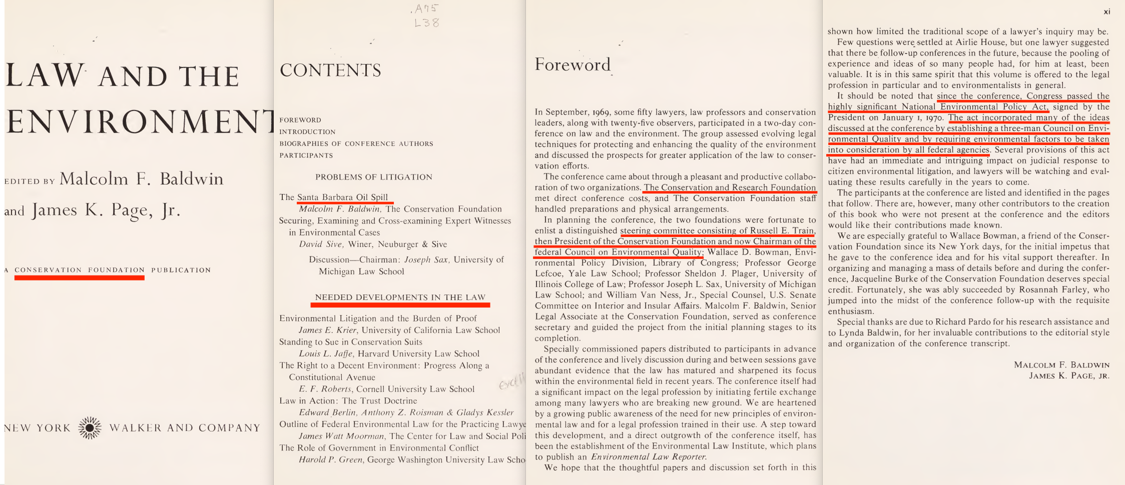 In 1969, the Santa Barbara oil spill20 took place, and this led to CF 1970 conference, ‘Law and the Environment‘. This outlined ‘needed developments in the law’, which ultimately yielded the National Environmental Policy Act, which as we saw above was essentially written by the Conservation Foundation itself.