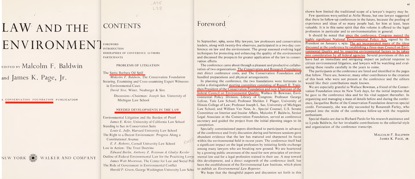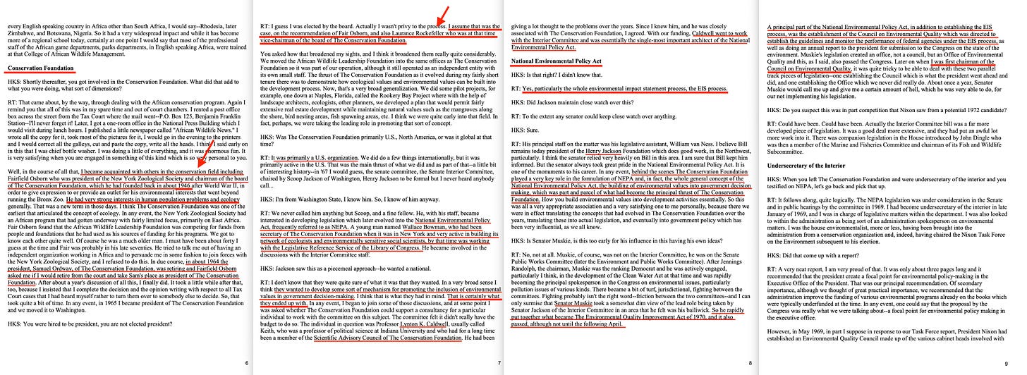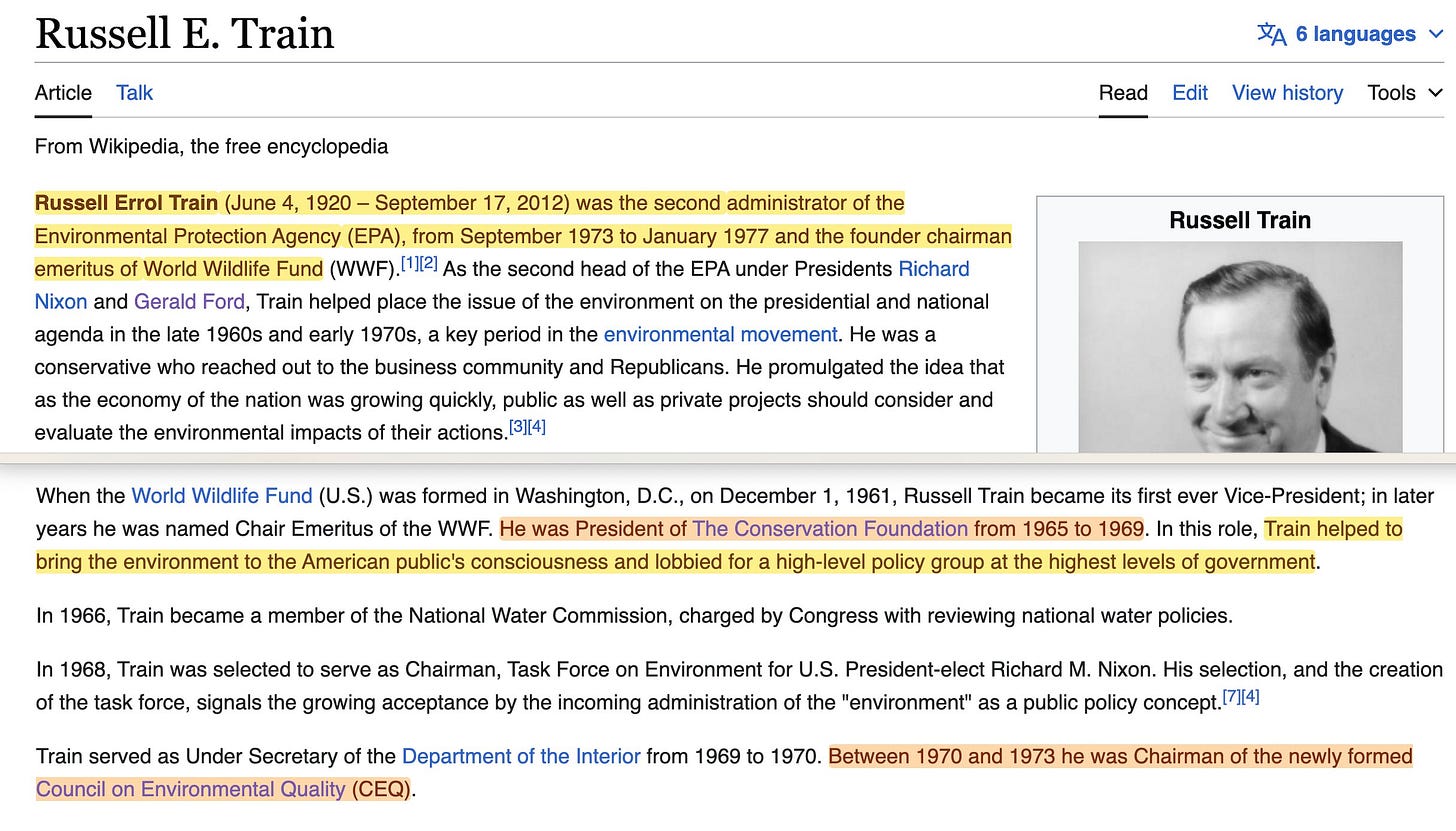 There’s a longform interview with Train over here10, and it goes on to further outline that not only did the Conservation Foundation write the National Environmental Policy Act, but they created the EIS process, and… the CEQ... which Train then would go on to lead -