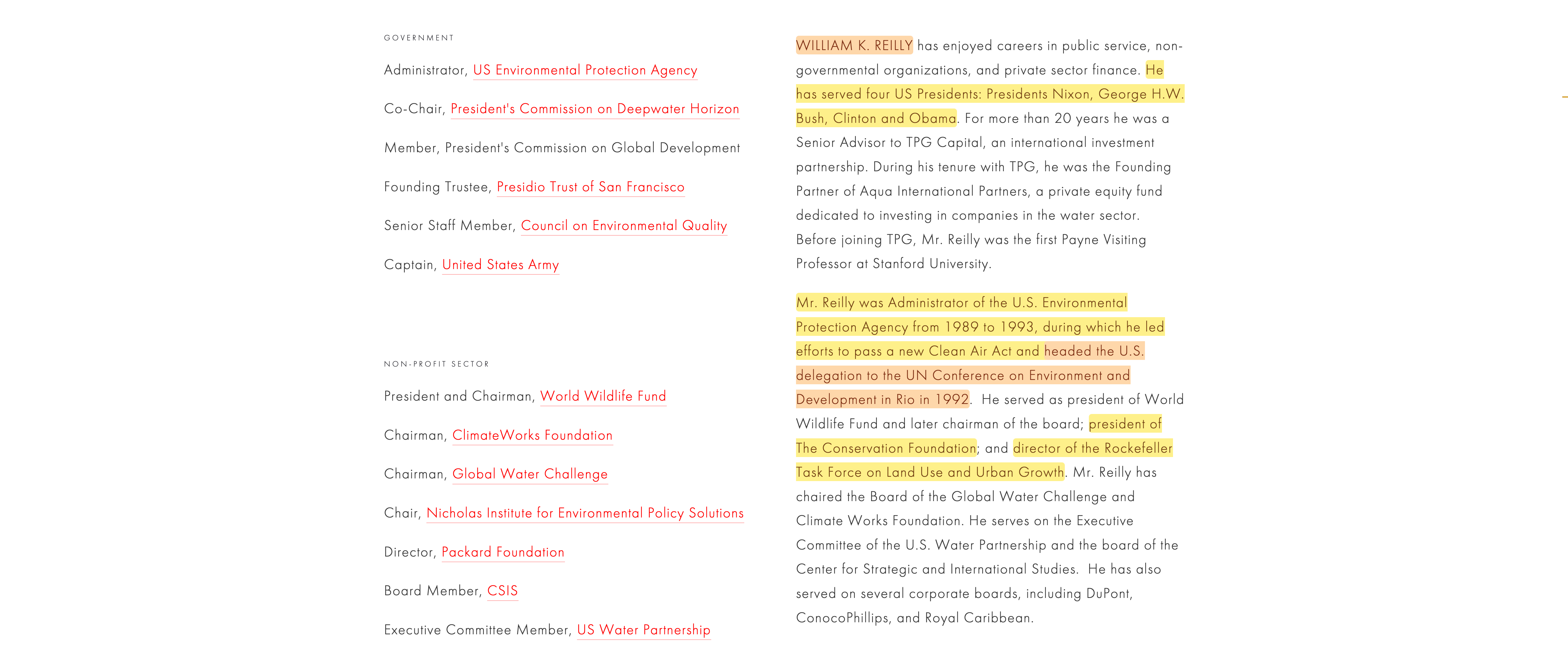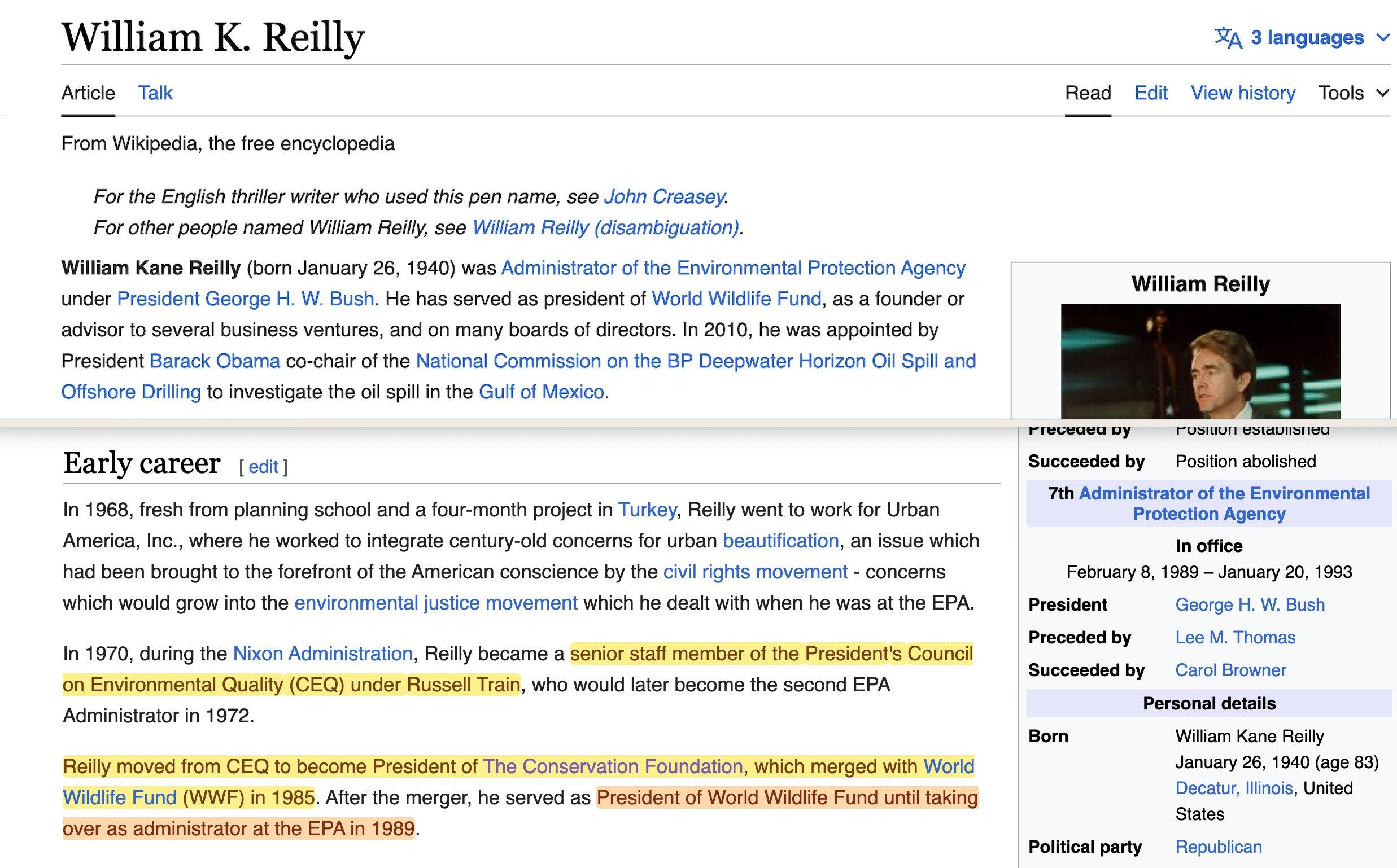 ‘… Administrator of the U.S. Environmental Protection Agency from 1989 to 1993, during which he led efforts to pass a new Clean Air Act and headed the U.S. delegation to the UN Conference on Environment and Development in Rio in 1992. He served as president of World Wildlife Fund and later chairman of the board; president of The Conservation Foundation; and director of the Rockefeller Task Force on Land Use and Urban Growth‘