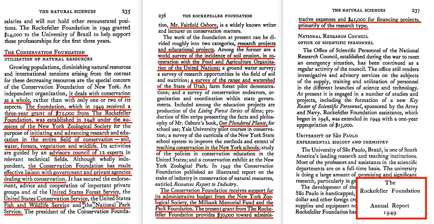In brief, the Rockefeller Brothers Fund paid for their operational expenses, while the Rockefeller Foundation itself funded their projects. I won’t bother going through these in detail, but I can confirm that funds were set aside for the ‘Conservation Foundation’, and that these are contextually relevant. In other words, this is a (yet another) Political Special Purpose Vehicle engaged by the… well, that American elite, and this one majors in conservation ‘science’... and policy.
