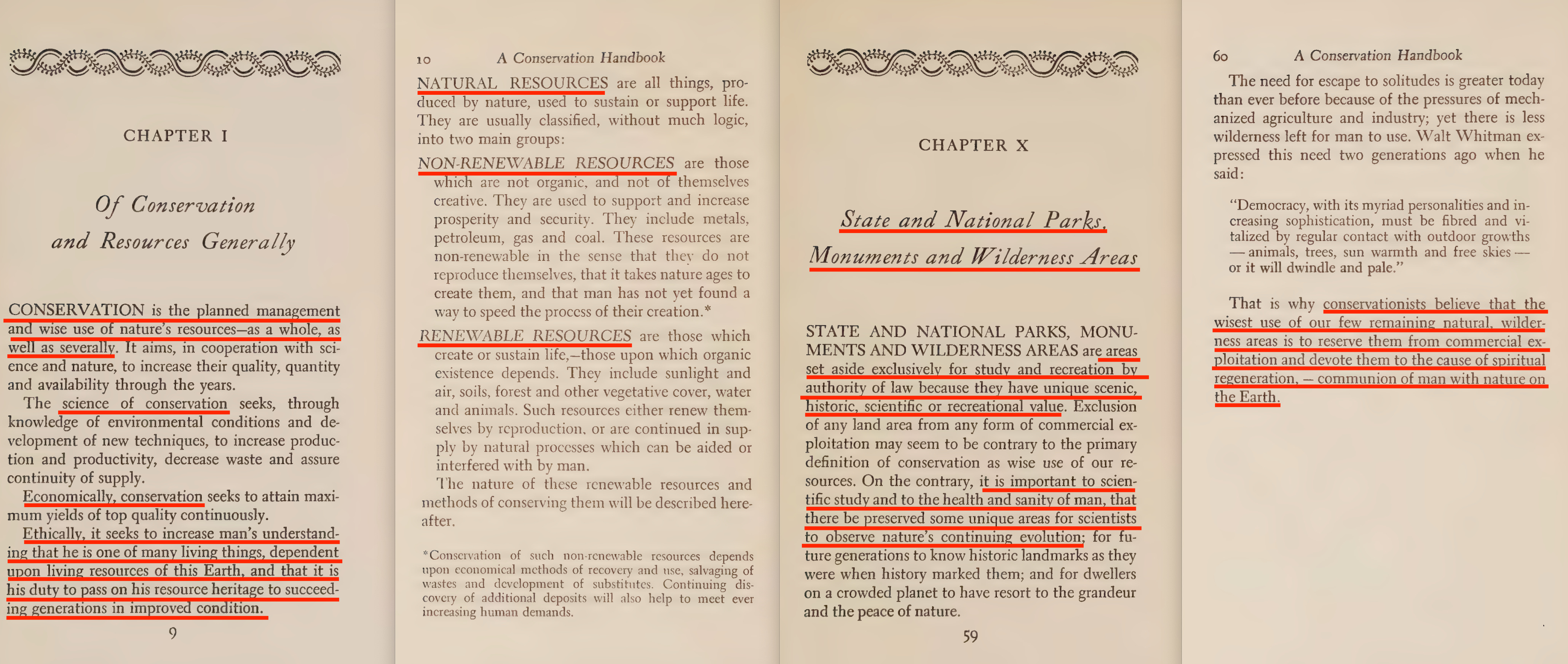 ‘STATE AND NATIONAL PARKS, MONUMENTS AND WILDERNESS AREAS are areas set aside exclusively for study and recreation by authority of law because they have unique scenic, historic, scientific or recreational value. Exclusion of any land area from any form of commercial exploitation may seem to be contrary to the primary definition of conservation as wise use of our resources. On the contrary, it is important to scientific study and to the health and sanity of man, that there be preserved some unique areas for scientists to observe nature’s continuing evolution; for future generations to know historic landmarks as they were when history marked them; and for dwellers on a crowded planet to have resort to the grandeur and the peace of nature.‘