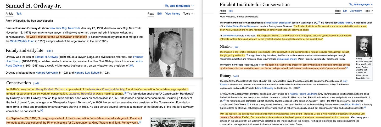 And it really is quite remarkable, because while I did leave out the founder of the Conservation Foundation, I might as well include him here for good measure. Samuel H. Ordway Jr16… he shared a stage with JFK at the Pinchot Institute17… on whose board, you guessed it, Laurence Rockefeller featured.