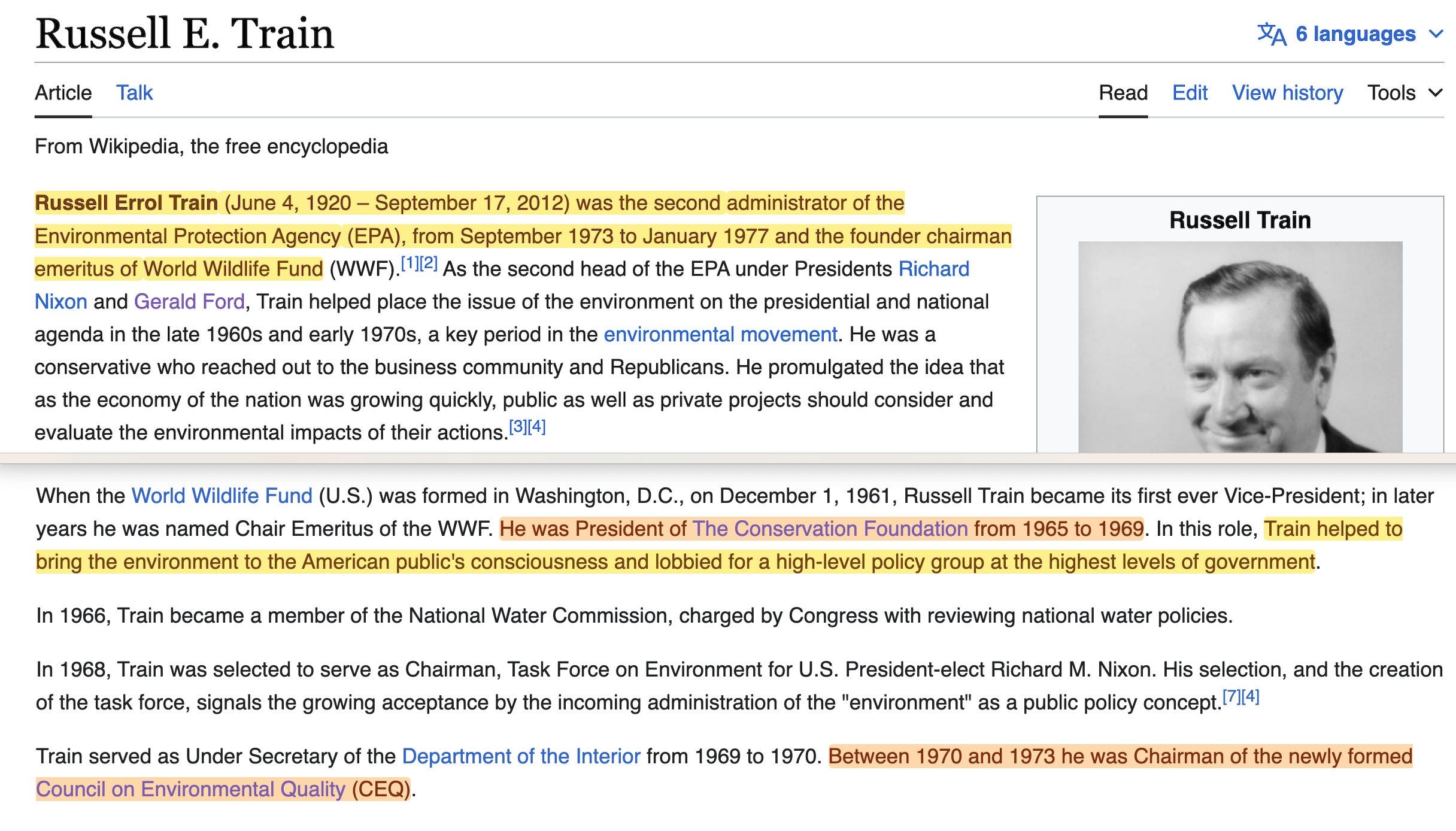 'He was President of The Conservation Foundation from 1965 to 1969... Between 1970 and 1973 he was Chairman of the newly formed Council on Environmental Quality'