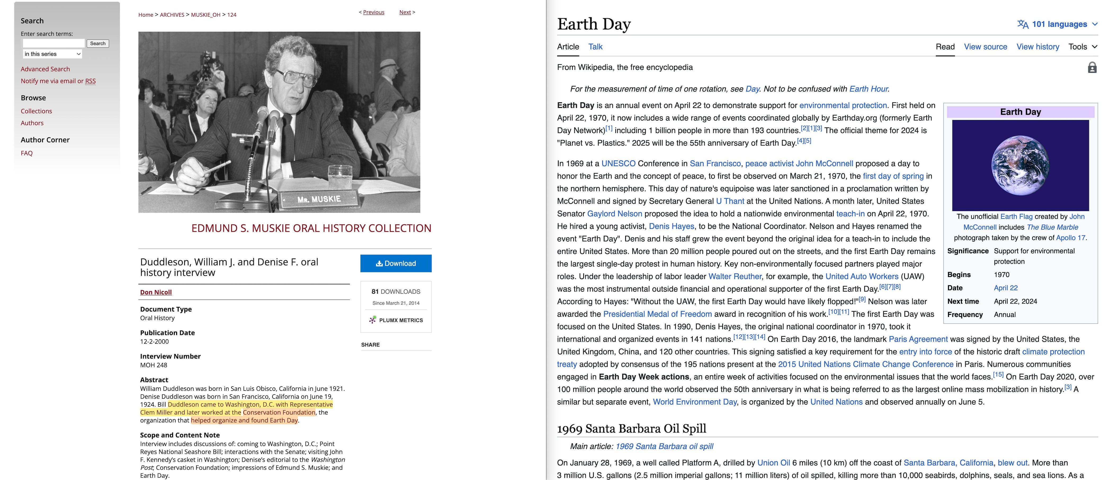 A principal part of the National Environmental Policy Act, in addition to establishing the EIS process, was the establishment of the Council on Environmental Quality which was directed to establish the guidelines and monitor the performance of federal agencies under the EIS process, as well as doing an annual report to the president for submission to the Congress on the state of the environment. Muskie's legislation created an office, not a council, but an Office of Environmental Quality and this, as I said, also passed the Congress. Later on when I was first chairman of the Council on Environmental Quality…‘