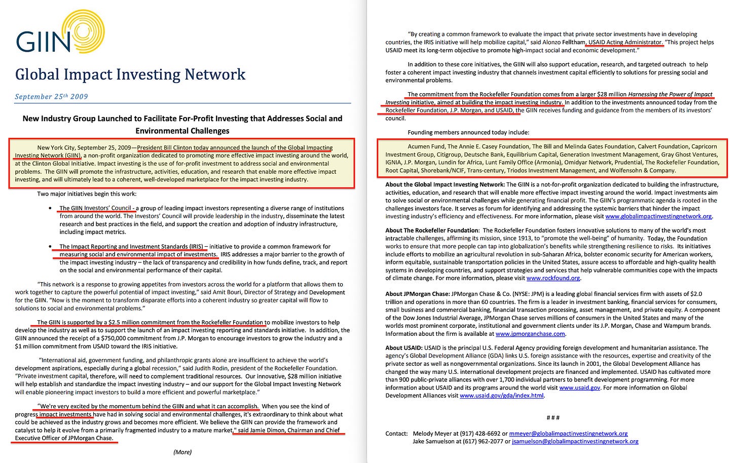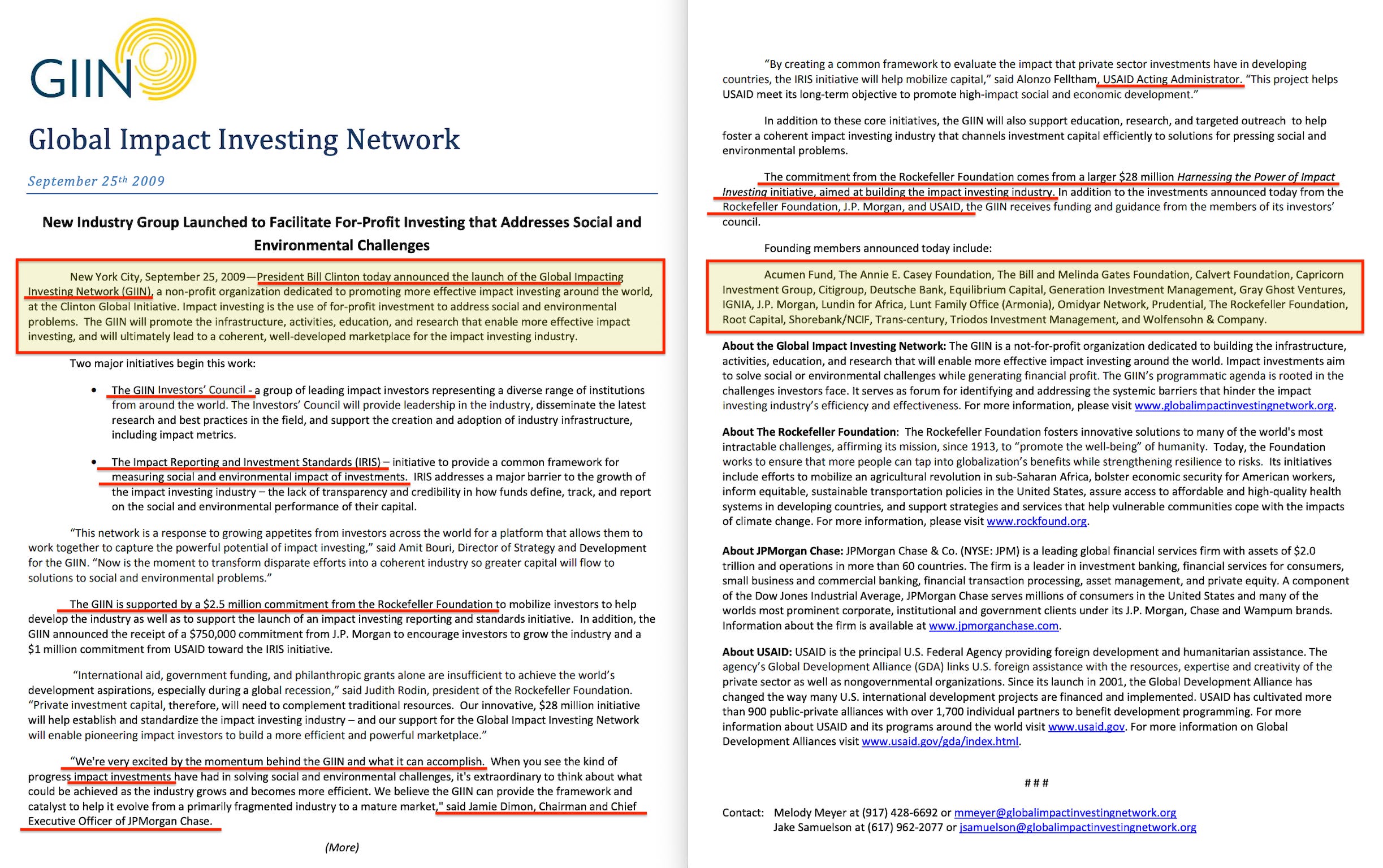 Bill Clinton launched the Global Impact Investing Network at the Clinton Global Initiative in September 200921 — six weeks after Epstein’s programme email. Hillary Clinton’s OPIC approved $285 million for impact investing funds in October 2011 — the same month JPMorgan brought Epstein onto a call with a Gates Foundation director about a ‘unique new impact investment product’ that Epstein had designed22. Hillary Clinton promoted social impact bonds at CGI America in June 201323.