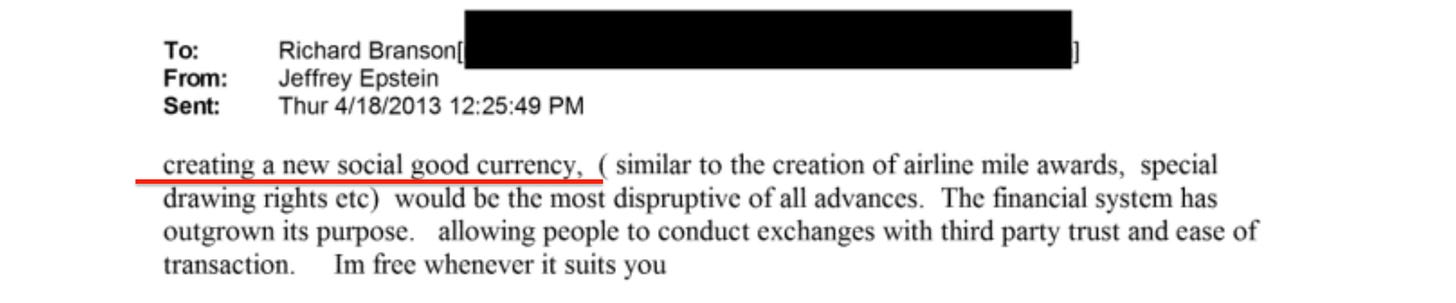 The fourth is the programmable currency itself: money that checks every transaction against compliance criteria at the moment it occurs. Epstein described it to Richard Branson as a currency like airline miles or special drawing rights, but for social good — conditional, programmable, purpose-bound27.