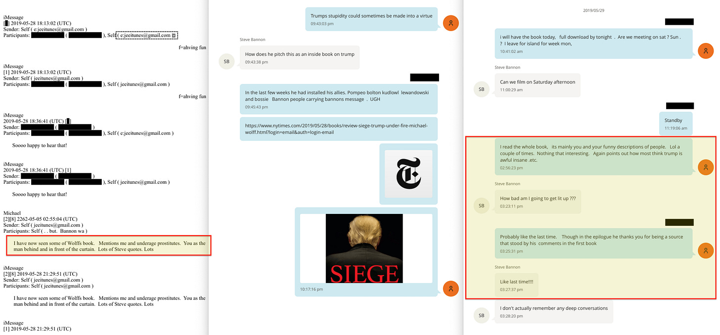 The released emails show Bannon fretting to Epstein about Wolff’s second book, Siege. Epstein, who had seen an advance copy, told him it contained ‘lots of Steve quotes. Lots’47. Bannon texted48: ‘How bad am I going to get lit up???’ Epstein reassured him: ‘Probably like the last time’. Bannon was asking the man whose information had been used to damage him the first time whether it was going to happen again. Epstein already knew, because he was the source for both books.
