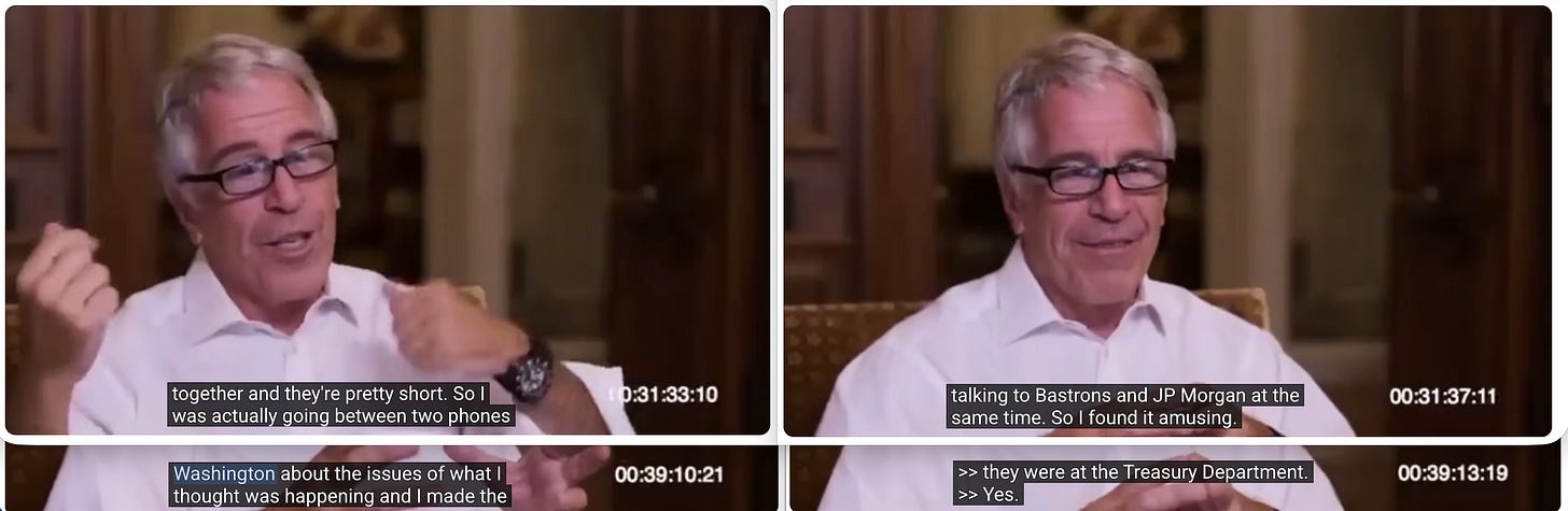 Later in the interview, Epstein confirms the operational nature of these relationships without naming names. He tells Bannon he was advising the US Treasury from a jail cell during the 2008 financial crisis, calling the president of Bear Stearns on one phone and a contact at JPMorgan on the other — ‘I was actually going between two phones talking to Bear Stearns and JP Morgan at the same time’. And the following day, he called ‘another person in Washington... they were at the Treasury Department’.