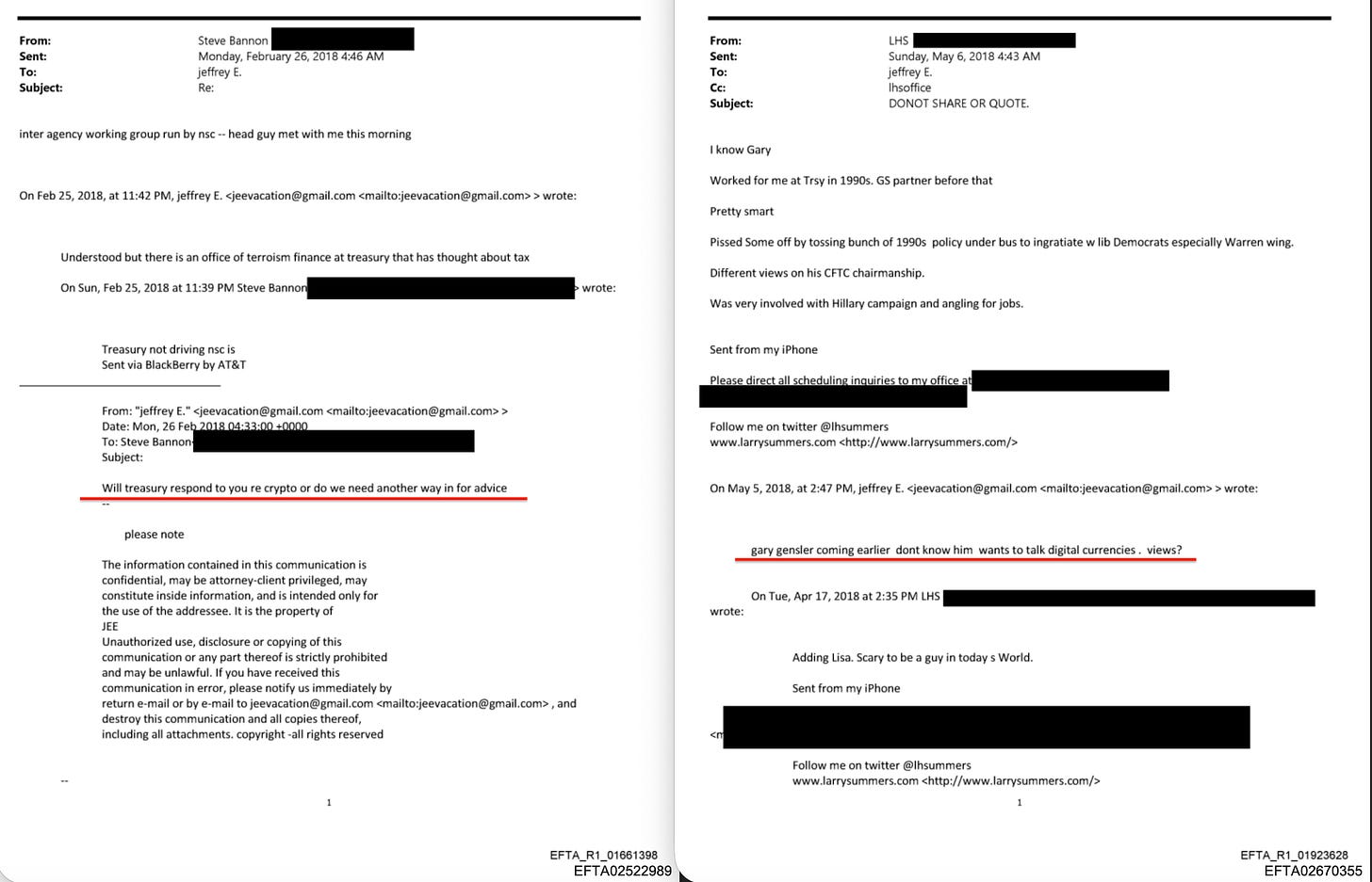 In February 2018, Epstein pressed Bannon on cryptocurrency regulation28: ‘Will Treasury respond to you re: crypto or do we need another way in for advice’. Bannon replied that the National Security Council, rather than Treasury, was handling digital asset concerns. Epstein was probing for access to the same institution he had been advising from a jail cell during the 2008 crisis — and whose former secretary, Larry Summers, had emailed him the sovereign digital currency specification two years earlier.