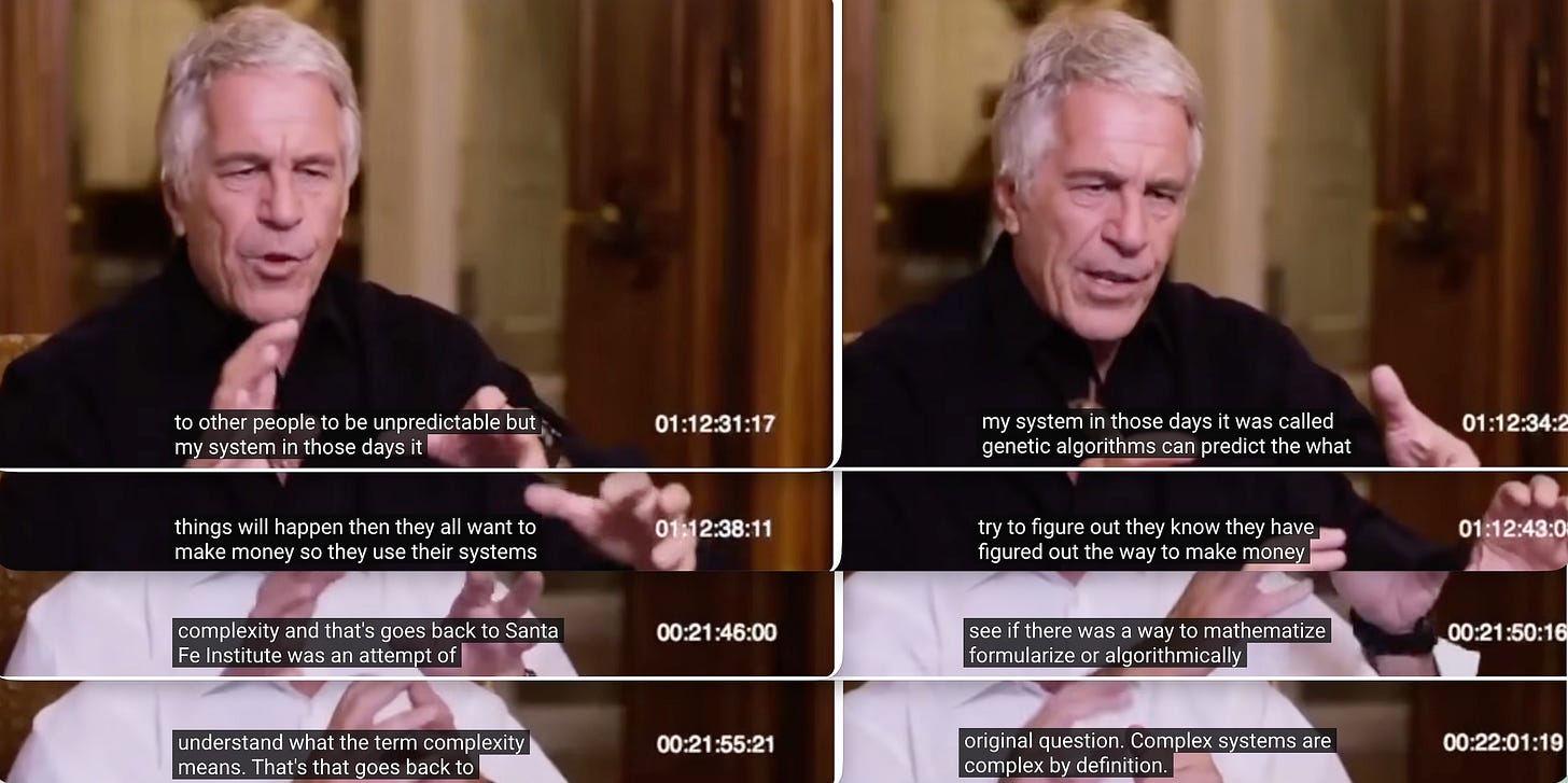 Epstein lays out the intellectual architecture of a programme to redesign the global financial system — from his recruitment by David Rockefeller, through the failure of mathematical complexity research, to the emergence of artificial intelligence as a replacement for human financial judgment. He describes it fluently, in plain language, without apparent concern that it is being filmed.