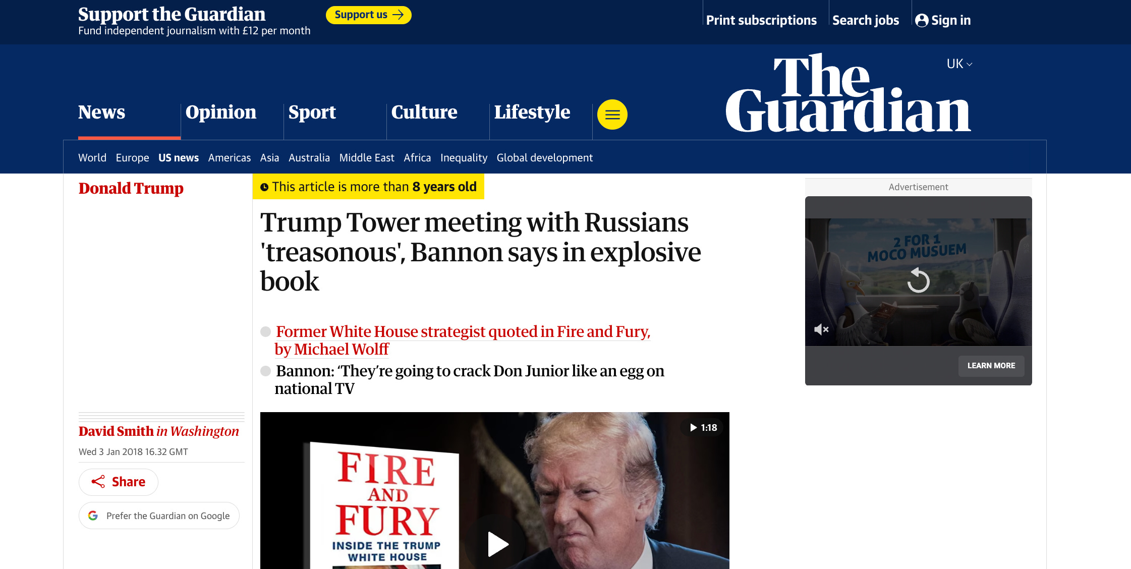 Fire and Fury, published in January 2018, contained Bannon quotes calling the Trump Tower meeting with Russians ‘treasonous’ and ‘unpatriotic’. Trump issued a statement saying Bannon had ‘lost his mind’46. Bannon was forced out of Breitbart and had to issue a public apology. The book severed Bannon from Trump’s inner circle, and its key source was Jeffrey Epstein.